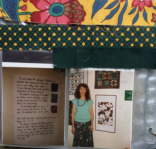 While going through my photo album I was so pleased to find how well I had documented the “sister city” challenge – between quilters in Madison, WI; Freiberg, Germany; and Berne, Switzerland. This is a picture of my album with a photo of the challenge poster, the fabric scraps opened across the top, and me standing next to my quilt. Don’t you love the 80’s hair?