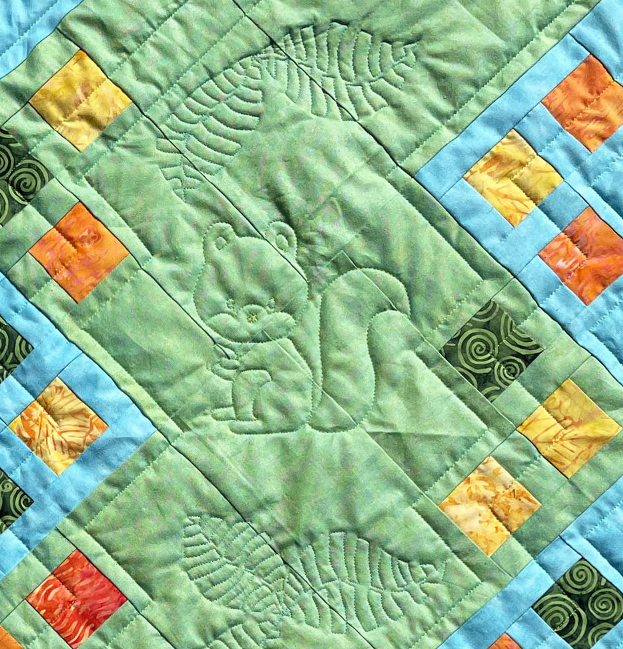 This got me to thinking about quilts I’ve made with squirrels on them. When my niece was expecting I made a woodland creature quilt for Josiah Thomas. The creatures were quilted in from drawings I found online.