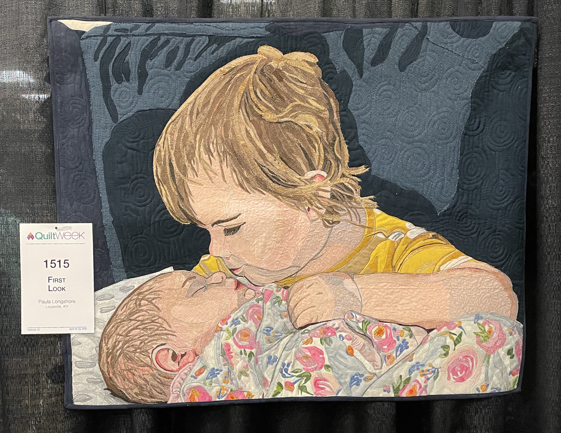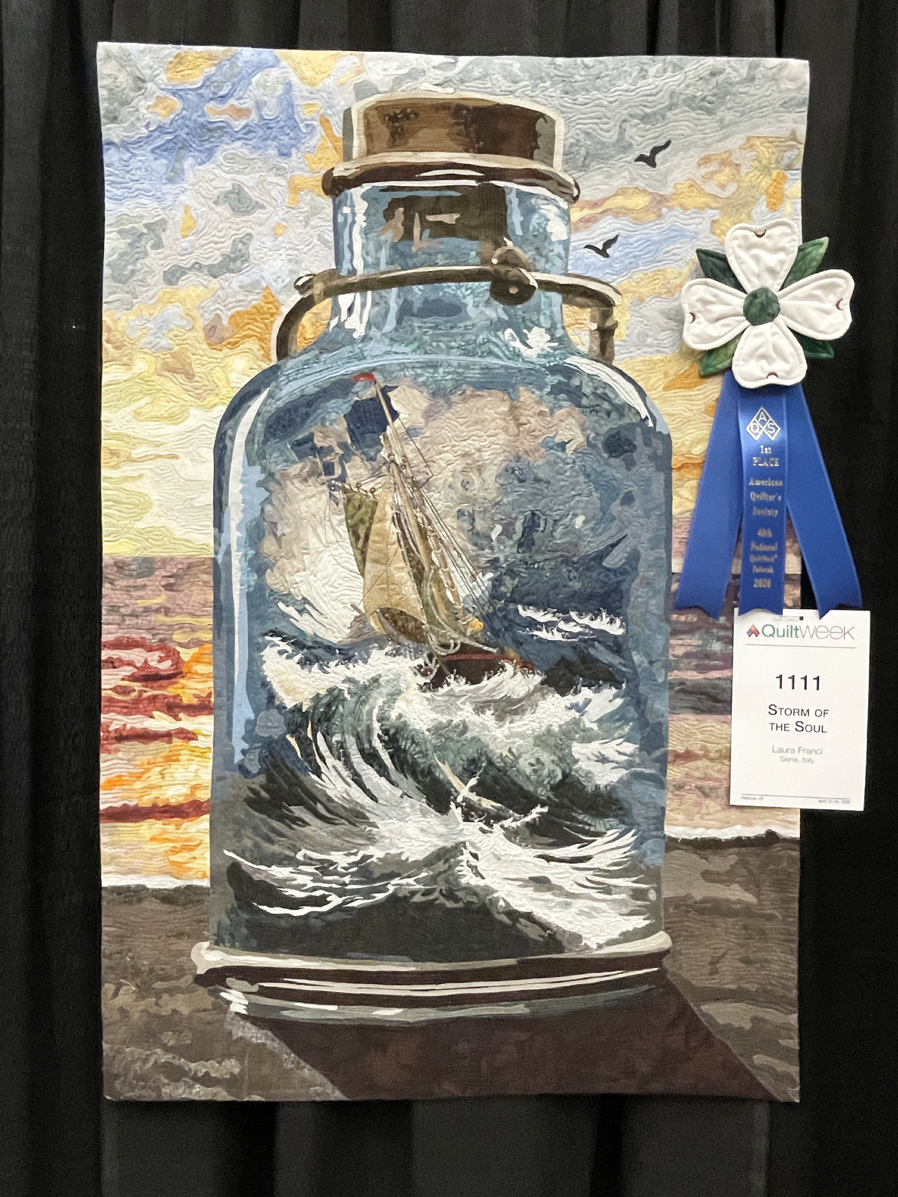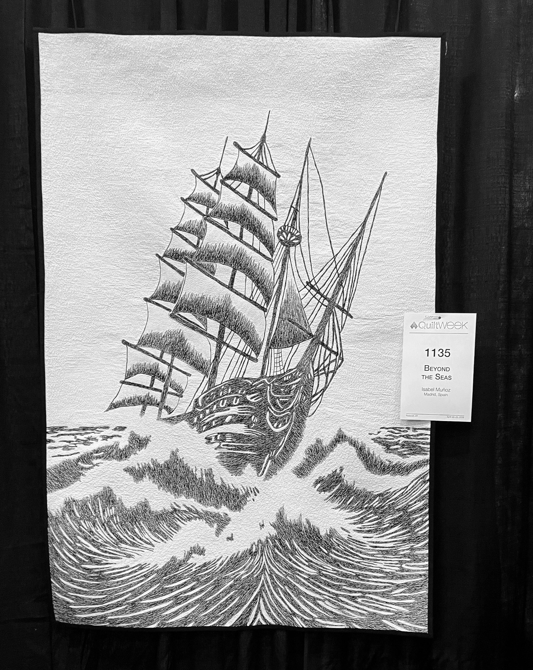 A little farther down the aisle I found “Beyond the Seas” by Isabel Munoz. I’m quite sure it’s a wholecloth, meaning there is a white fabric background and everything else is thread painted in black. Stunning!