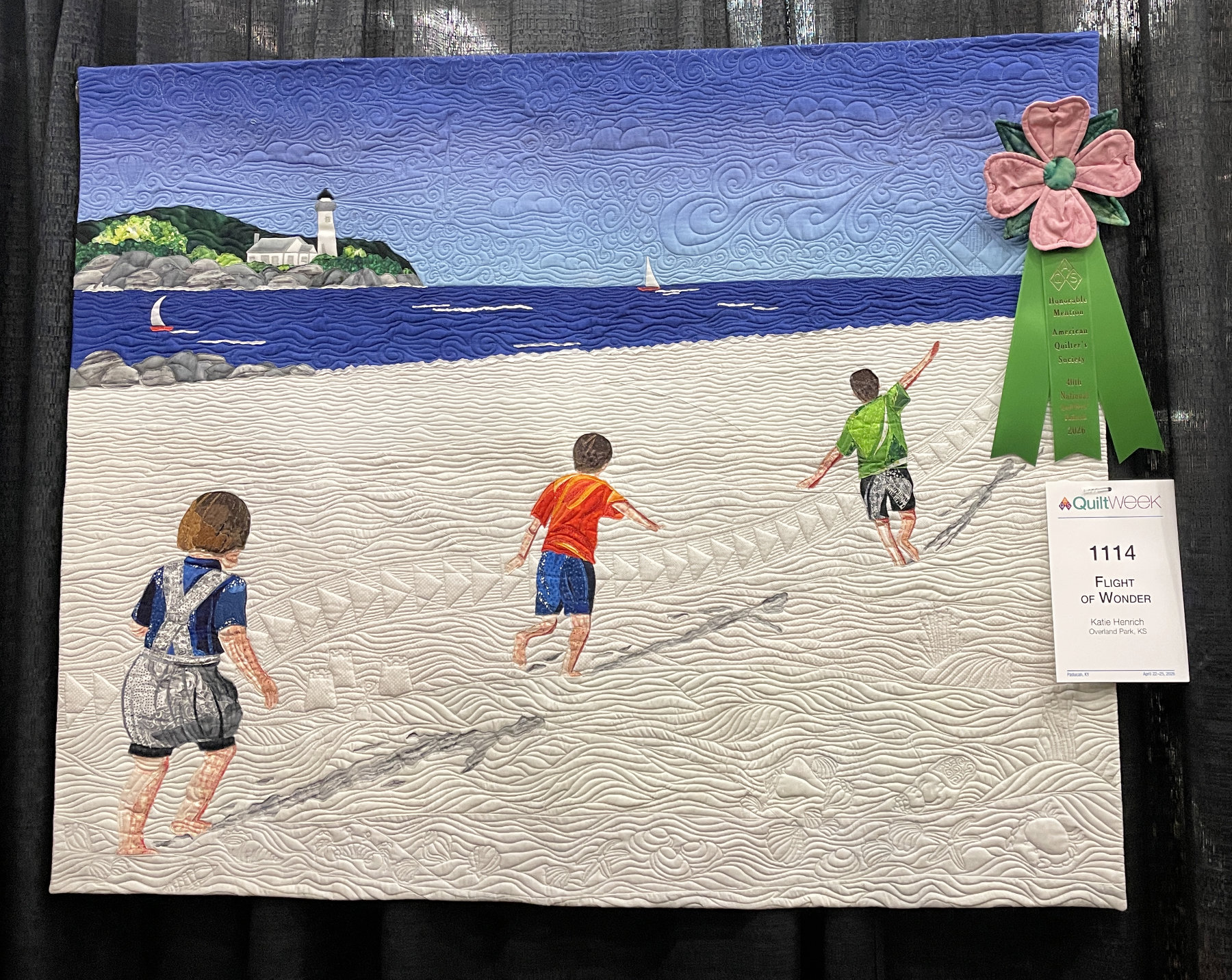 Katie Henrich made “Flight of Wonder” from a photograph she took of her sons on the beach. The “geese” flying along with the boys against the beautiful seaside backdrop makes this quilt special.