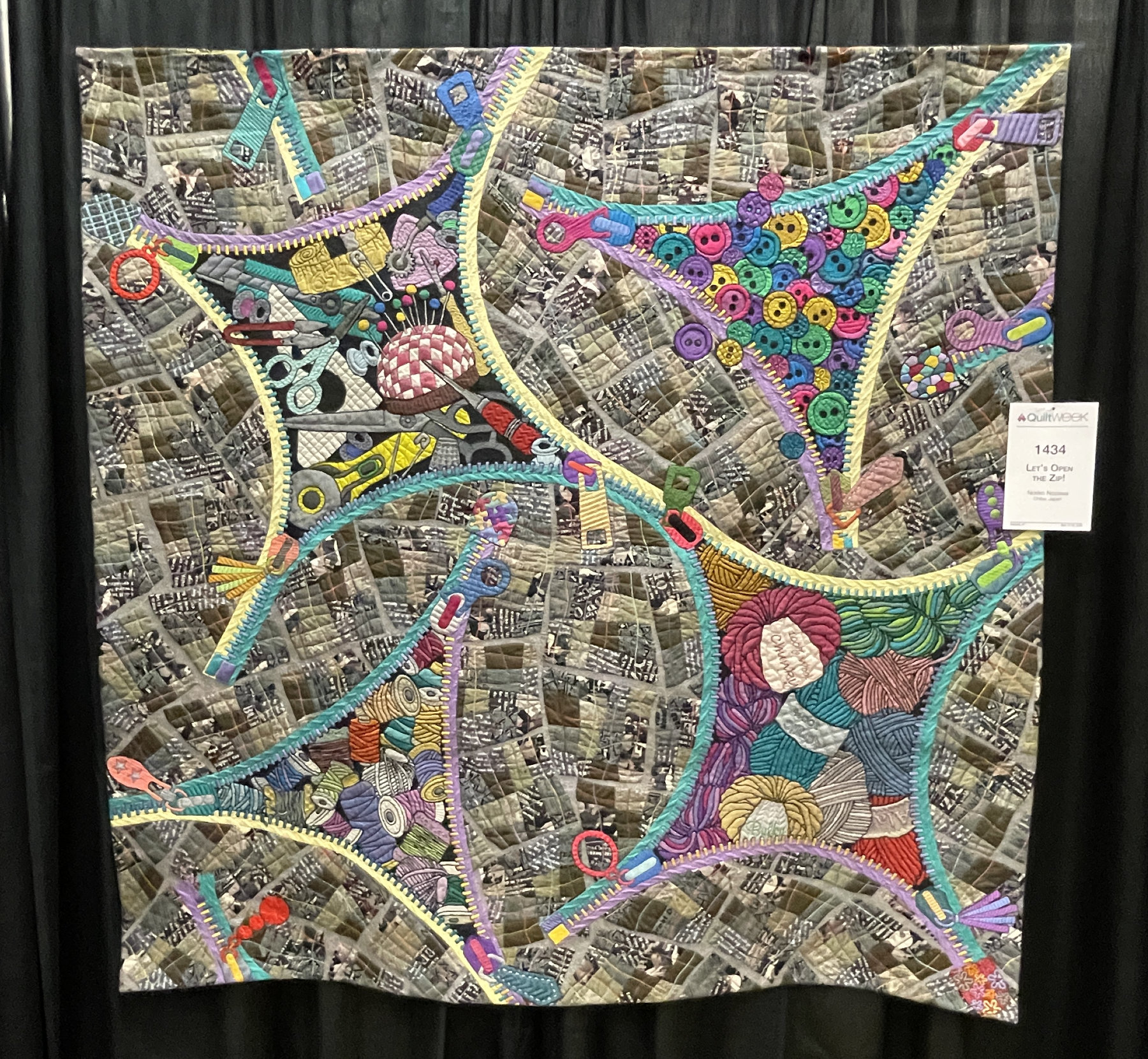 And since we’re on the subject of clever… my final quilt from the upstairs gallery is “Let’s Open the Zip” by Noriko Nozawa. The “open” areas are filled with buttons, notions, yarns and threads. Sew very clever.