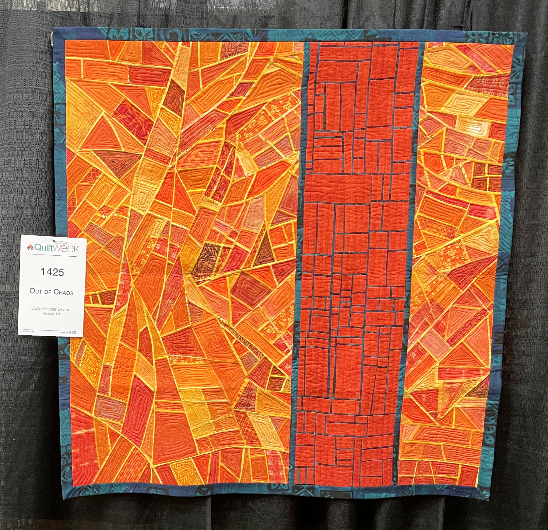One of the first quilts that caught my eye was “Out of Chaos” by Judy Zoelzer Levine. Judy and I have been friends for years and of all her quilts, this is my favorite. I love orange – and the design is captivating.