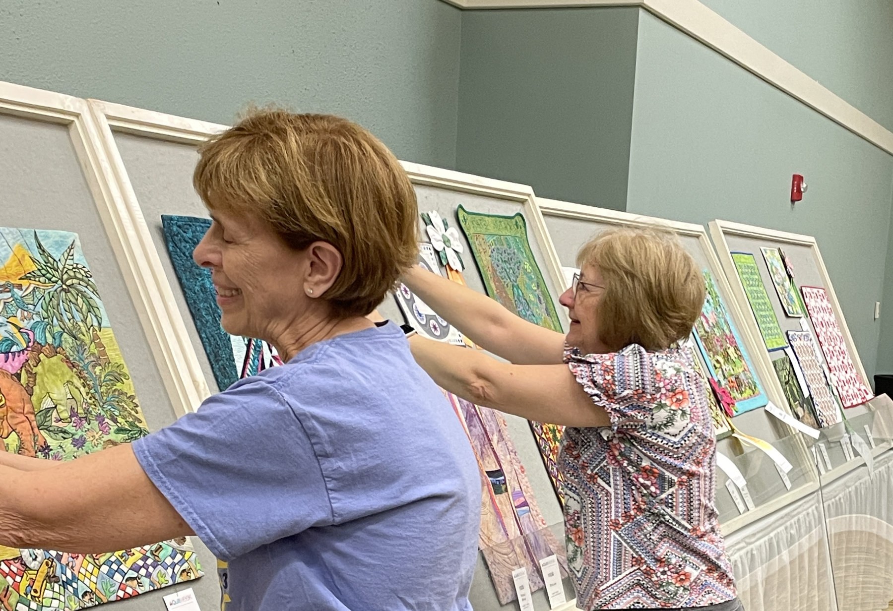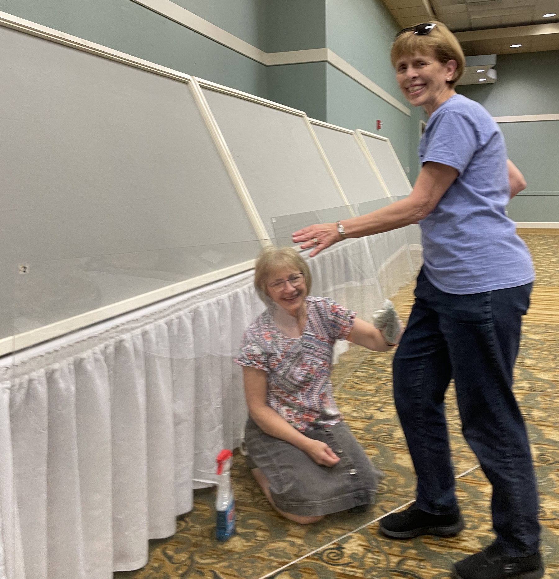 Late that morning we headed over to the convention center and helped to hang the quilts. Once they were up it was time to pin the miniature quilts into the cases. We really enjoy doing this. Even the glamorous parts, like cleaning the glass: