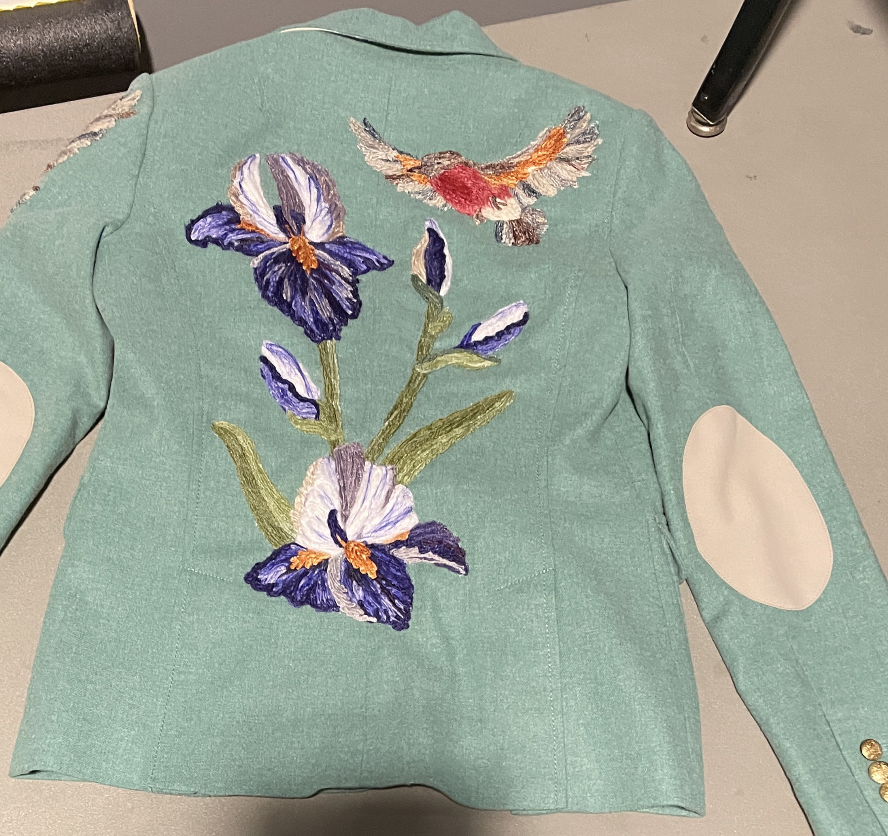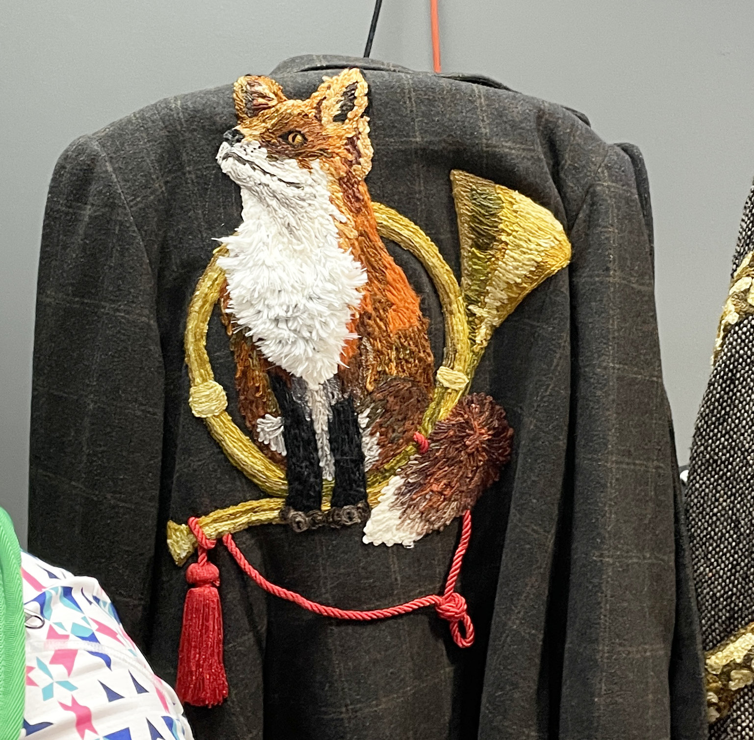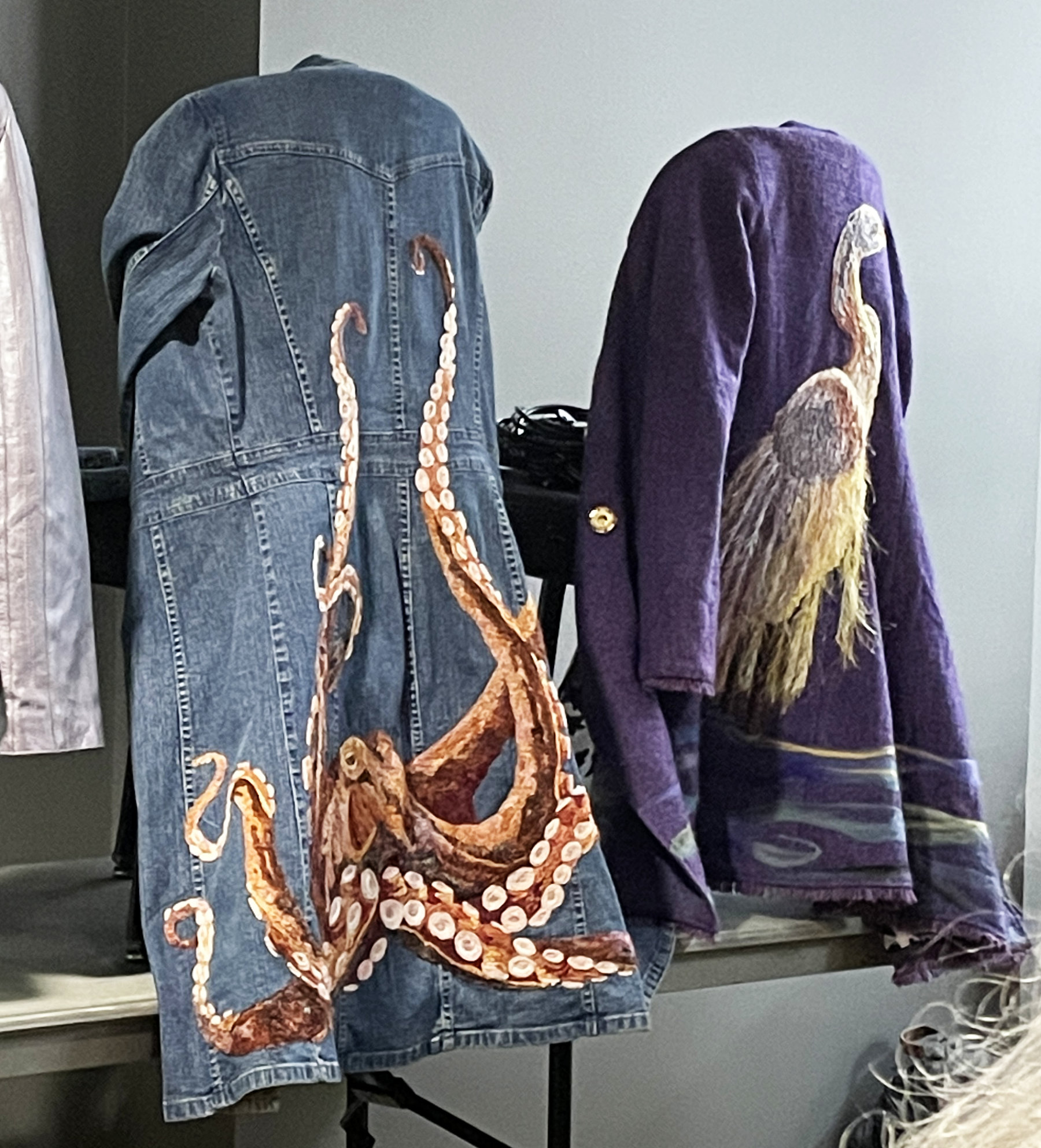 The first day of the show Susan and I attended a lecture on yarn couching by Bethanne Nemesh. Wow! Not only is she a creative and talented quilter, she adorns clothing and home accessories with yarn couched animals and botanicals. Just look at some of the coats she shared with us.