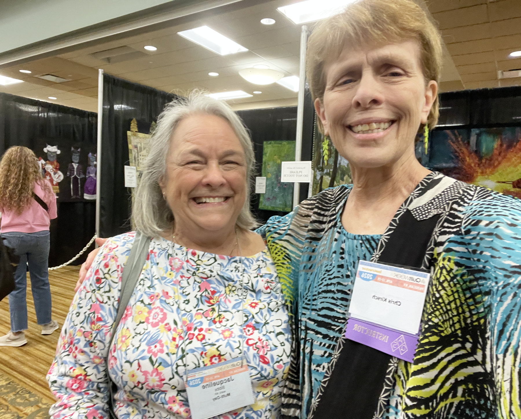 It’s the people! As I was wandering through the wall quilts Jacqueline approached me and said “Hi Chris, I was hoping I’d run into you. I took your free motion quilting class here 2 years ago and I was short $3 to purchase your book. You gave me the book anyways and I’ve been wanting to pay you back with interest ever since.” She handed me a $5 bill. What a sweet lady! When I tried to decline she wouldn’t let me, and then she said that she was a long arm quilter and she is still using some of the techniques she learned in that class. I was joyful and humbled. A teacher can’t hear anything better than that a student is using what they learned in class. Thank you Jacqueline!