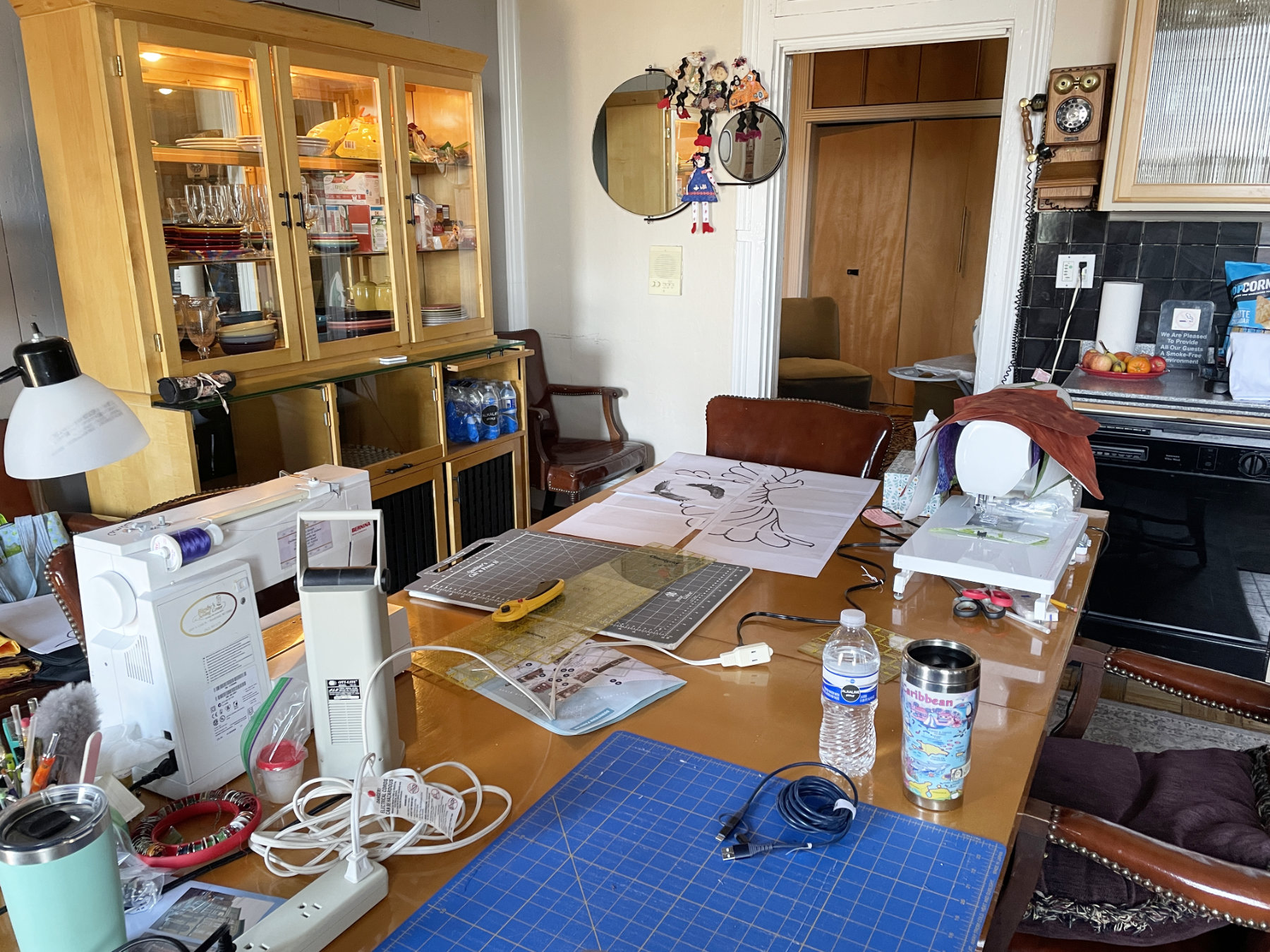 And they smelled heavenly. Everything was beautiful and green. We unpacked and set up our “studio” in the kitchen of our the second story guest house as usual (note all 4 quilt sissies hanging around on the mirror top center 😁).