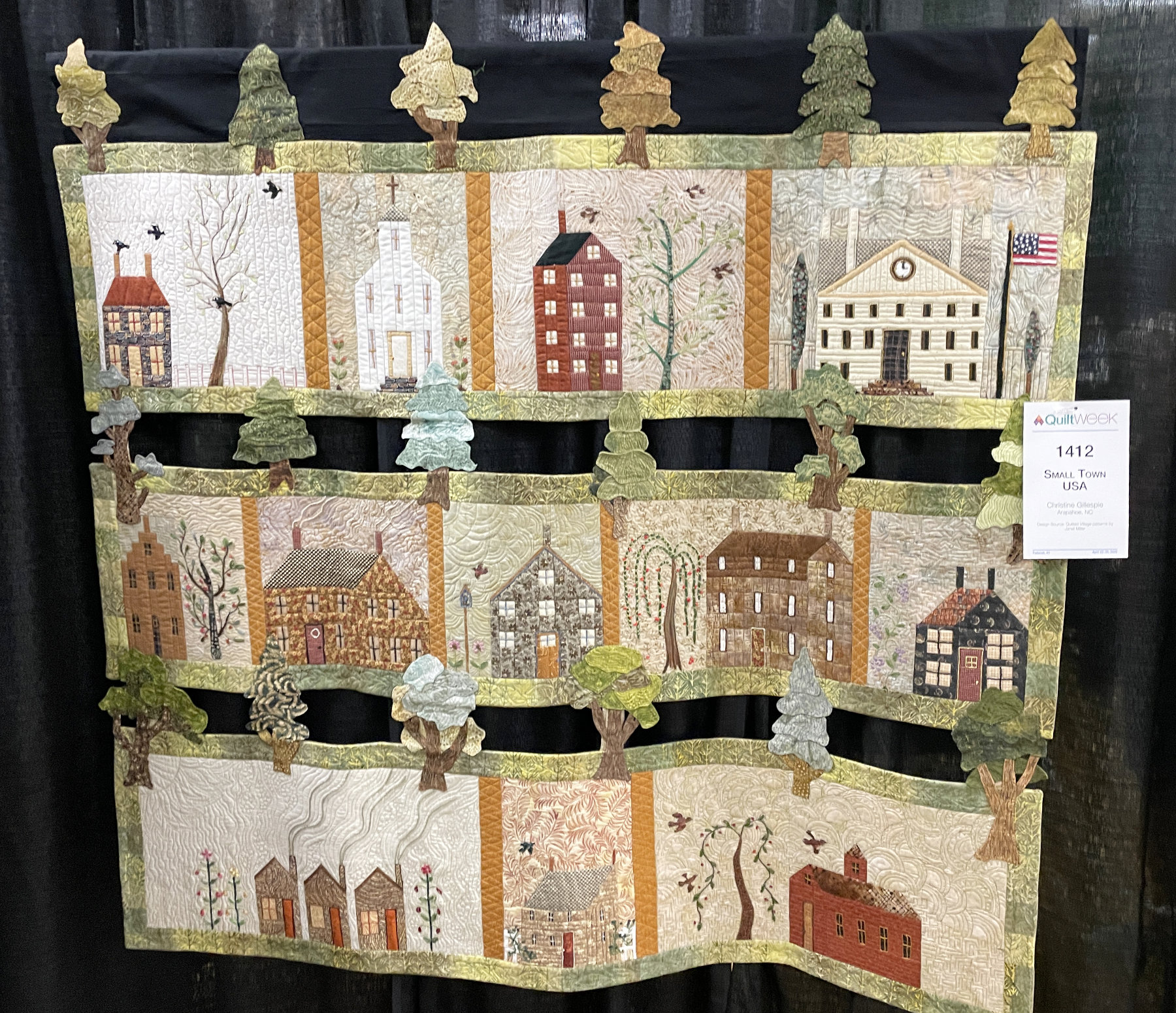 When I walked up to “Small Town USA” by Christine Gillespie I found the buildings charming, but then I noticed that the trees are what are holding the horizontal rows together. The black curtain behind is showing through. How clever.