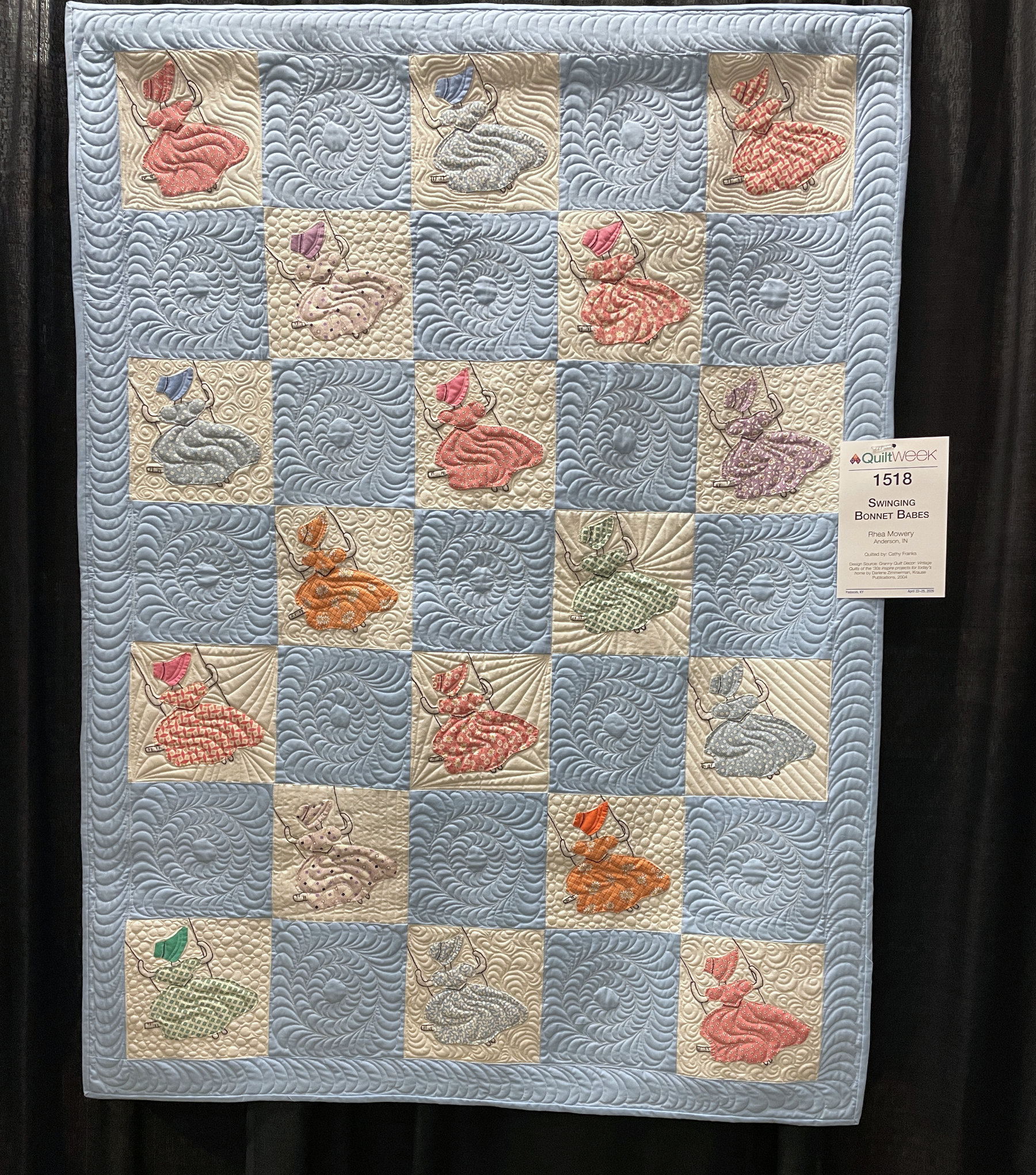 At this point I was only part way through the small wall quilts, so here are a few more. I loved the vintage feel of “Swinging Bonnet Babes” by Rhea Mowery, and her quilting added so much motion.