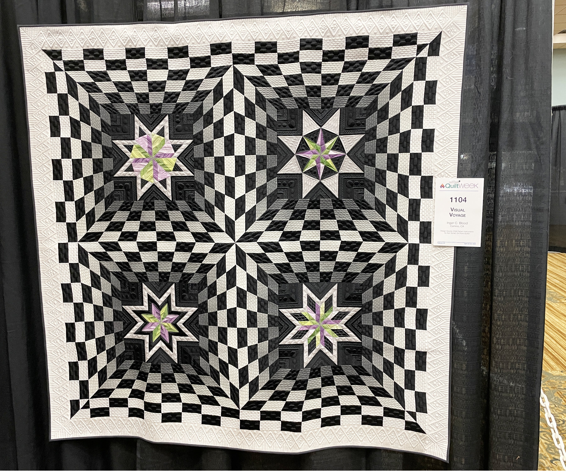 I am often attracted to quilts with dimensional perspective and “Visual Voyage” by Inger Blood has such depth.