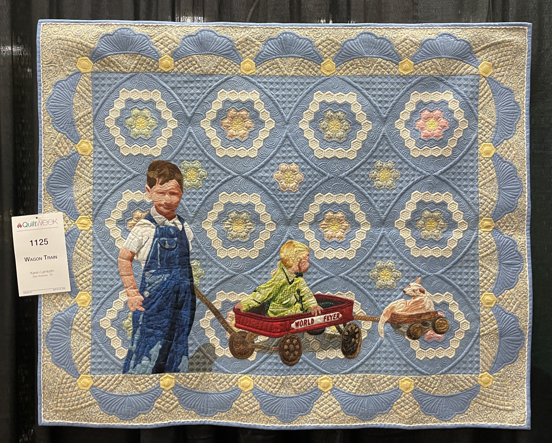 “Wagon Train” by Karen Lambdin is a lovely grandmother’s flower garden quilt with stunning quilting. What a wonderful backdrop for the sweet wagon train. Charming.