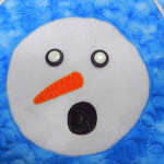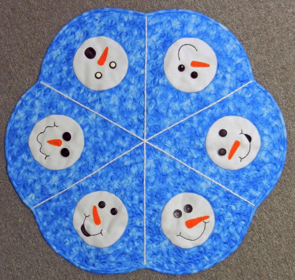 In my teaching at WCTC it’s necessary for me to come up with class ideas 2 semesters ahead of when they’ll be taught. This can be a bit daunting, so I often make up a class name and description without really knowing what the quilt will look like (it adds excitement and mystery to my job :-)). This Fall I made up a class I called “Snowperson Topper”. When the time came to actually stitch something I decided a scallopped hexagon shaped table topper with snowman faces would be fun.