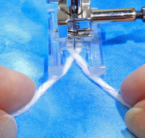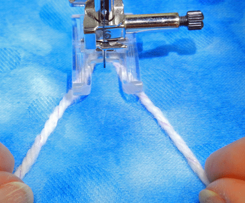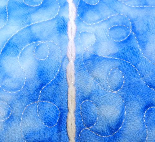 with a few innovations too. It was fun giving a unique personality to each of the snowpeople. I got to go through my button collection to find just the right pair of eyes for each face, did some hand stitching on the felt noses and free motion embroidery of the mouths. Once the faces were made, the sections needed defining and I decided a bit of couching was in order.Couching means to attach a yarn or other fiber to the top of the quilt by laying it on the surface and stitching it down with an additional thread. This can be done by hand or machine. When it’s done by machine a zig zag or some other decorative machine stitch is usually used. Years ago my dear friend and traveling partner, Wendy, showed me a simple alternative couching technique that’s as easy as: