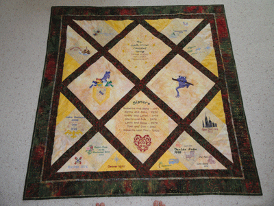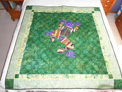 “Hi Chris, I would be happy for you to use my quilt – that’s why I sent the pics. I made the quilt for my college friend going through chemo this spring. We adopted a purple bean bag frog one evening and “Floyd” has been our mascot ever since. We are a group of 6 roommates and have continued our friendship over the years. My inspiration was a ceramic frog climbing a wall in a cute restaurant in St. Pete’s Beach in Florida. The other side of the quilt is a history of who we are and where we have been:). (We are the Sixth Street Convent Gang because we lived in an apartment with more rules than the dorms had in 1970, it was nearly cloistered!) Gloria Knipschild”