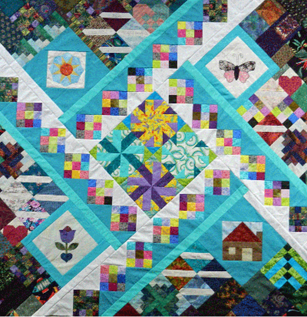One of the techniques we used in class was to enlarge a block by adding corners to it, and thus turning it “on-point” (as in the Sun block in the upper left and the house block in the lower right). It struck me this would make a good blog topic! When I’m turning blocks I like them to have a bit of “float” around the original square. By adding this extra fabric at the block corners, there is no danger of chopping them off. I’ve discovered that I don’t like to go to the effort of turning these blocks to an exact size, so I make them a bit larger and square them back to the size I want. It’s a “non-math”, “seat of your pants”, method and I hope you like it.