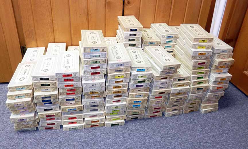 So Mike made room for it in the trunk of the car and I didn’t allow myself to open it until we were home and unpacked. What an adventure opening that box was! It contained 237 boxes of DMC floss!!