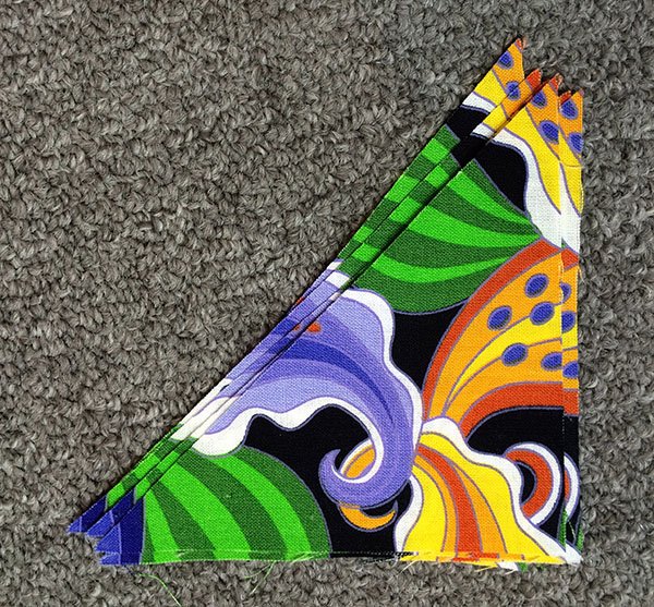 My stars begin as four stacks with 8 identical triangles in each. Here’s a portion of a Jane Sassamann fabric that worked great, and just one triangle stack: