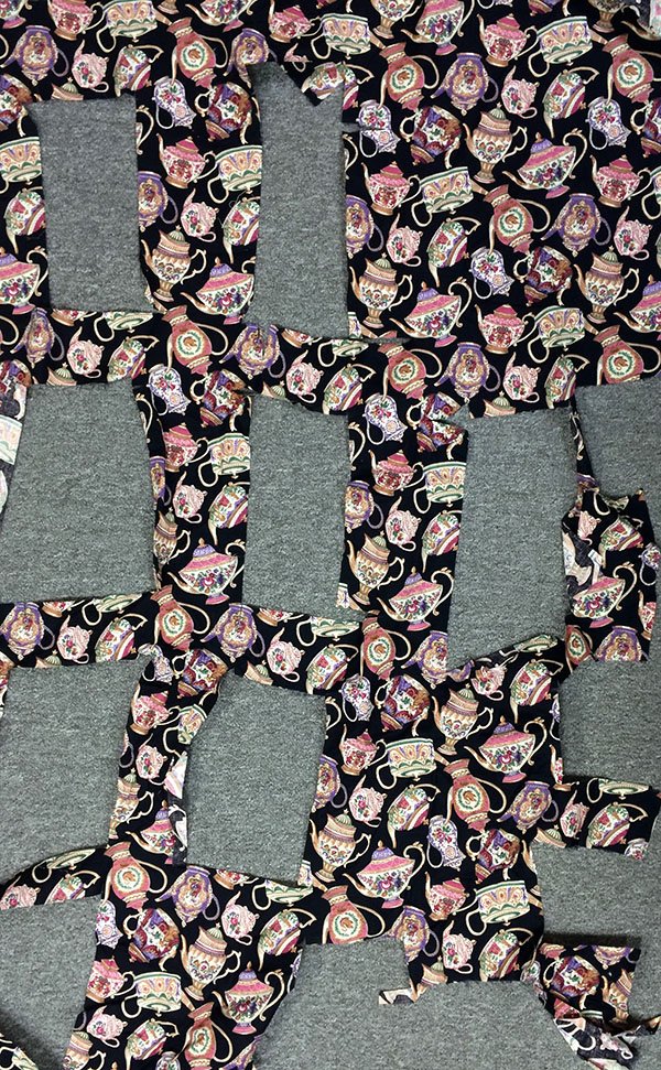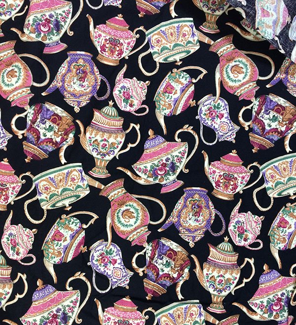 Fussy cutting motifs from fabric is a technique that has been around for generations. It was made incredibly popular about 20 years ago by Bethany Reynolds (click here for her website). At that time I was intrigued by Bethany’s quilts and started playing with my own style of cutting identical triangles from large print fabric. To begin, I chose a teapot fabric with a lot of thin lines and curves.