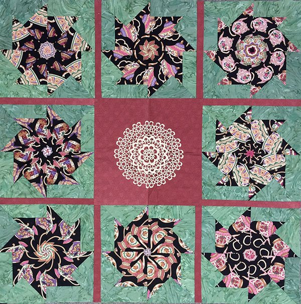 Isn’t the variety of stars amazing? And the fun part is, if I had cut the triangles just an inch away from where I did, every star would be different from these. I must admit, it’s addicting. I showed this quilt to friends and students, and my Spin Star class was born. It has been extremely popular over the years and I think the appeal lies in the fact that each star is a surprise! The down side is that it makes “swiss cheese” out of your fabric: