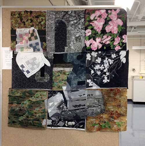 enlarge the photo to 50″ square, and divide it into a large 9-patch. Colored corner and center squares alternate with black and white ones (you’ll have to look closely to see it in the picture).Garden of Grace with black and white squaresThis made the entire quilt one large 9-patch. A line drawing was made next,