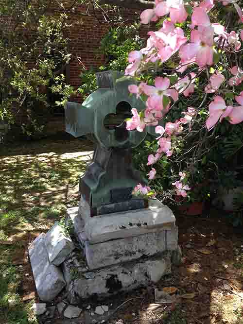 So, Linda and I had lunch this past Friday at Grace once again and I was surprised to find that the crumbling base on the cross in the church yard had been repaired and the large dogwood branch cut away.