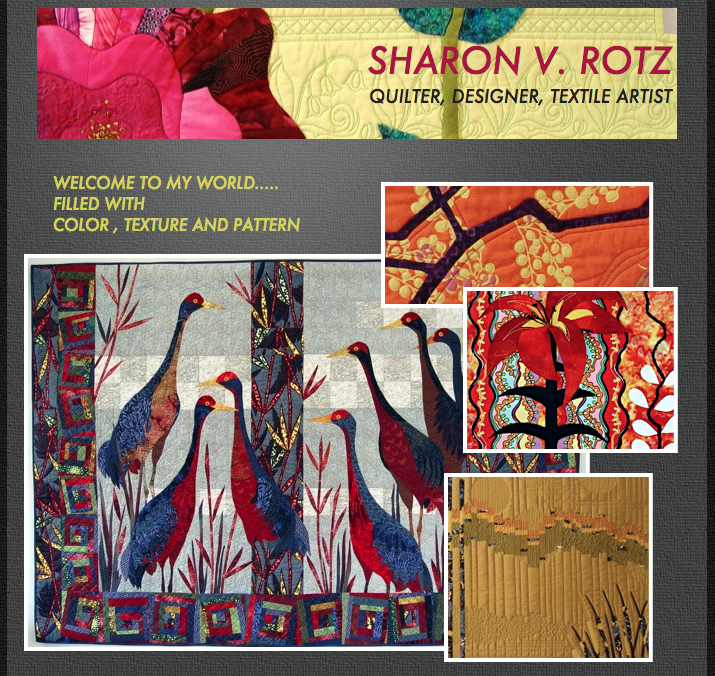 Now, let me tell you about their maker. I met Sharon Rotz when we taught together at a retreat in Central Wisconsin. We hit it off right away and have become good friends. I’ve mentioned Sharon in a number of previous blog posts because we’ve had the chance to exhibit our work together, and I’ve been inspired by her books and techniques. We’ve also collaborated on 4 quilts together: “Tumbles the Cat”,