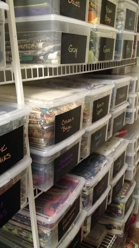 “Chris: I really wanted to tell you how much I admire and am always searching for those perfect solutions to sewing room organization. Last year, I was able to move my sewing room into a bigger space thanks to my really awesome husband. That space came with an enormous walk-in closet!! I wasn’t sure how to organize my stash, so one trip to The Container Store and voila!! Men’s shoe boxes from The Container Store are the perfect size for your stash!! I then bought chalkboard fabric and labeled each box. They are also the perfect size for projects. Here’s a picture to share.”