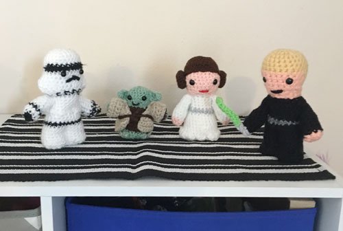 Last year I saw a pattern on the internet for crocheted Star Wars characters. I sent the link to my Mom. She’s amazing at crocheting and reading patterns. Trey got the stormtrooper and Yoda for his birthday and Sommer got Leah and Luke (complete with light saber) for hers.