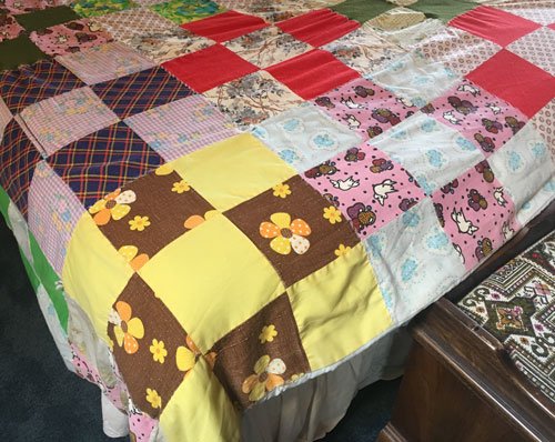 I was thrilled! I decided my first project should be a quilt for my “hope chest”. I cut a 6″ square from cardboard and dug out all of the scraps from our sewing projects. There were cottons, denims, flannels, crepe d’chine, seersucker and even some wool! I traced around the cardboard on the wrong side of each scrap and cut out all the squares with a scissors. Once the squares were cut I laid them out in 9-patches (I didn’t know that’s what they were called then) and sewed them together.