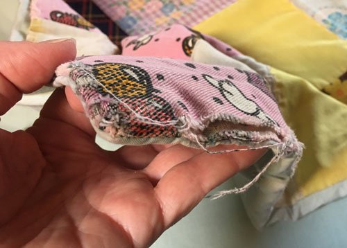 Along the same lines, after my mother-in-law died I found a box of quilted squares she had hand-sewn back in the 1970s. I washed and ironed them. My daughter-in-law helped me sort them by color and helped me design them into a baby quilt for grandson #2. The leftover blocks I used to make throw pillows for family members. It is a treasure for all of them to have the quilt blocks. In that case, I backed each block with a muslin and again, stitched a decorative stitch over each seam to catch both sides of the fabric and help it last.