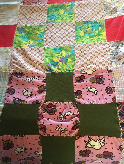 Yet the fabrics are filled with memories. The pink denim with doves above was used in my favorite pair of hip hugger, bell bottom jeans (just picture that – it was the 70’s). In the following photo the brown floral was a sundress, the light blue flannel was a nightgown of mine, and the purple with flowers was from an apron I made for my German “mother” when I did a class trip to Germany my junior year.