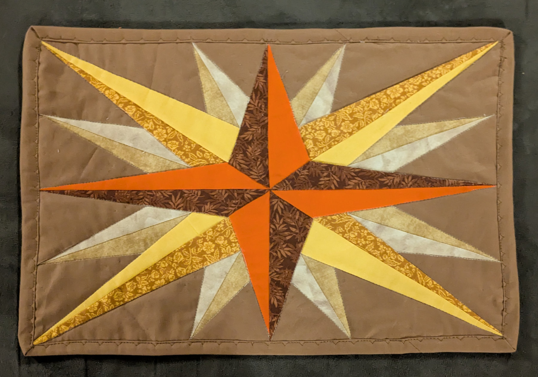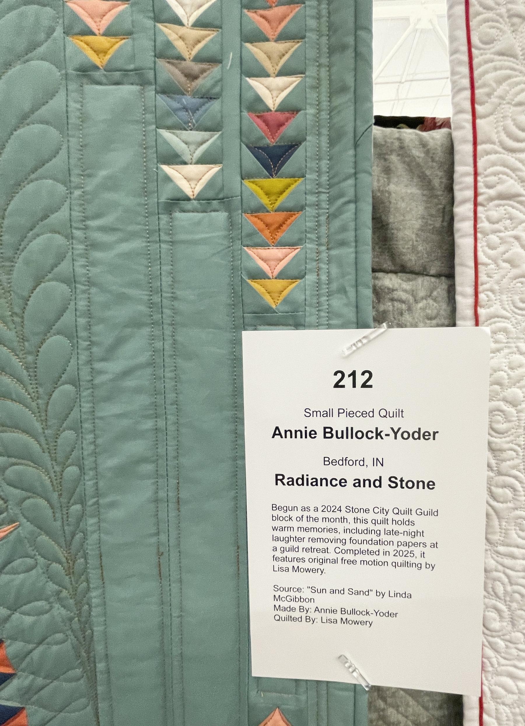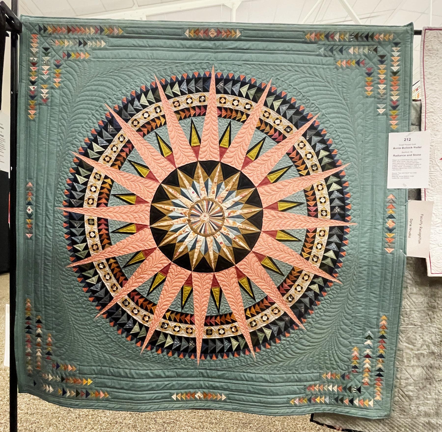 And while I’m on the subject of great piecing, “Radiance and Stone” by Annie Bullock-Yoder has flying geese galore, along with a spikey center medallion. I really like her color palette.