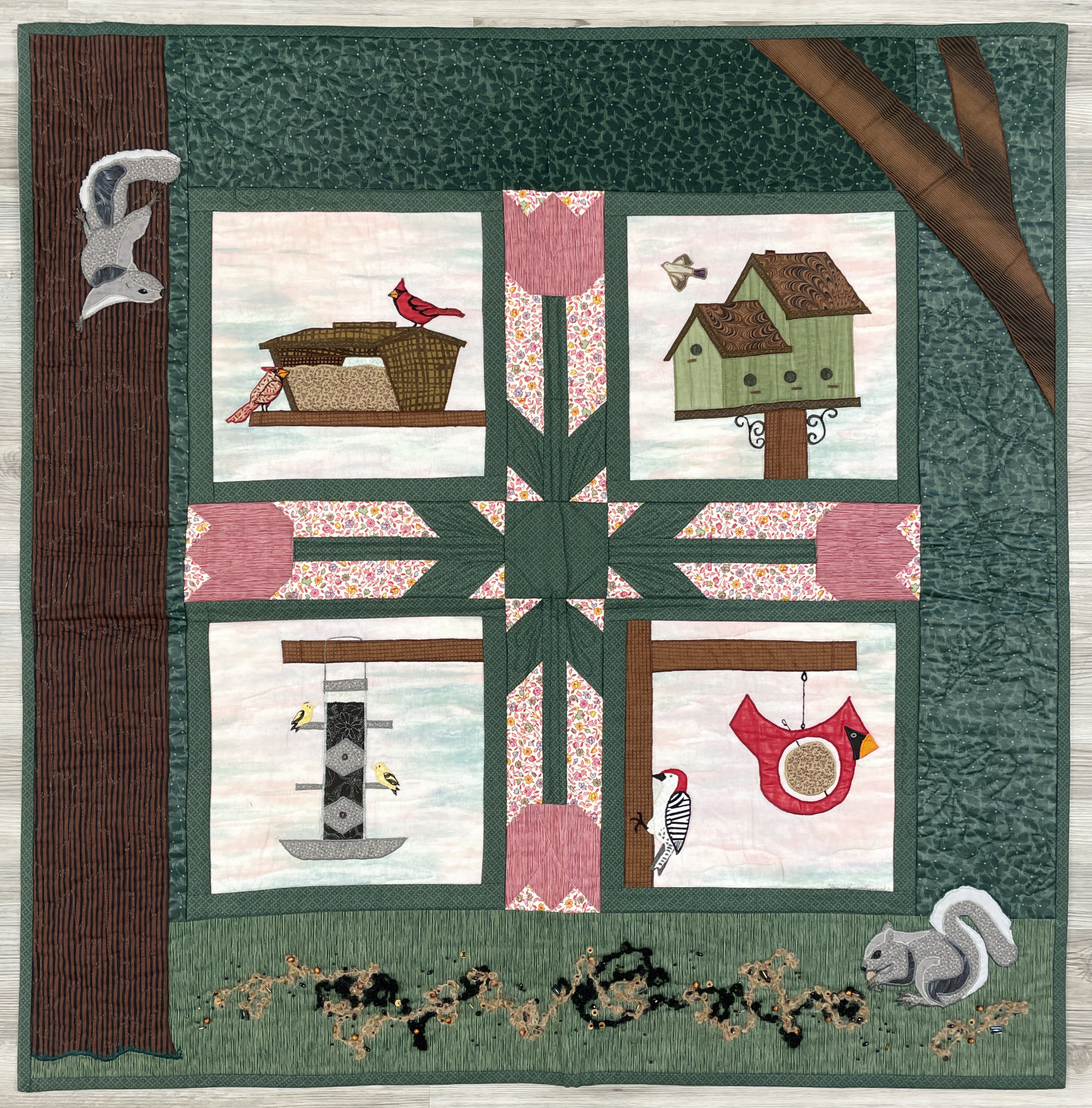 My favorite part was finding all the sweet critters she lovingly stitched throughout the quilt.