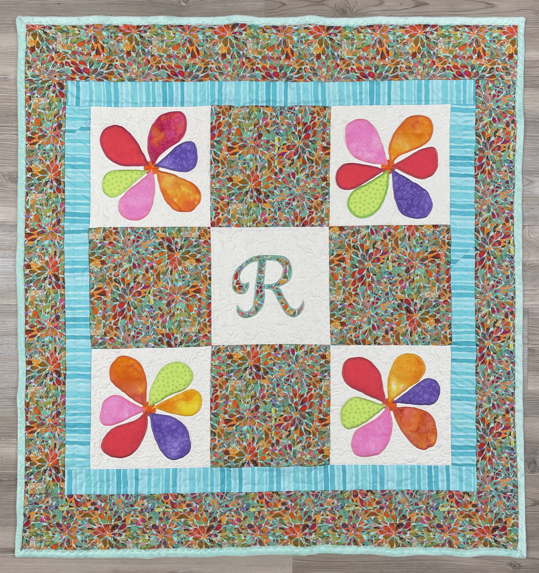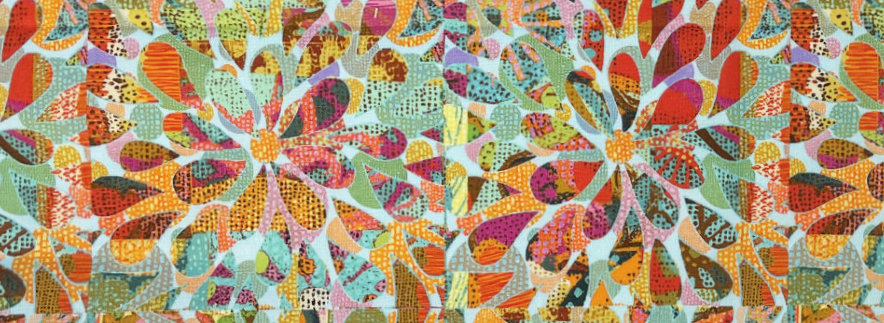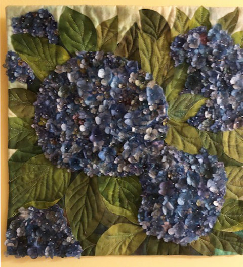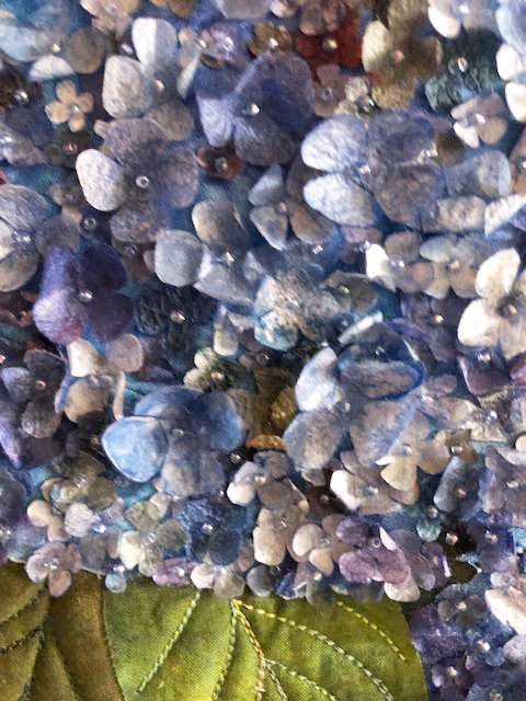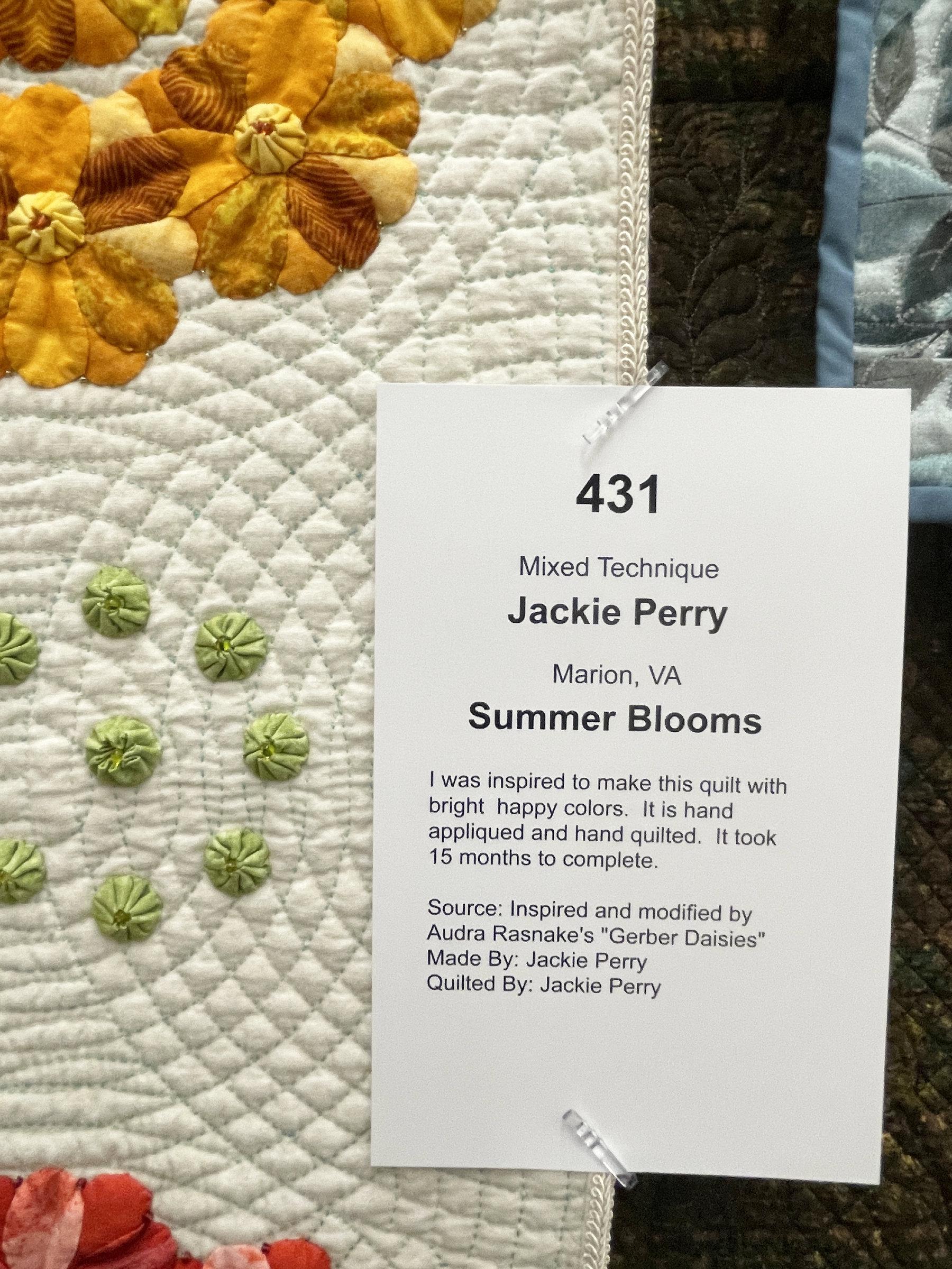 And the last quilt I want to share is a wall hanging of flowers with fun quilting and delightful tiny yo-yos. Jackie’s hand-quilting “knocked my socks off”: