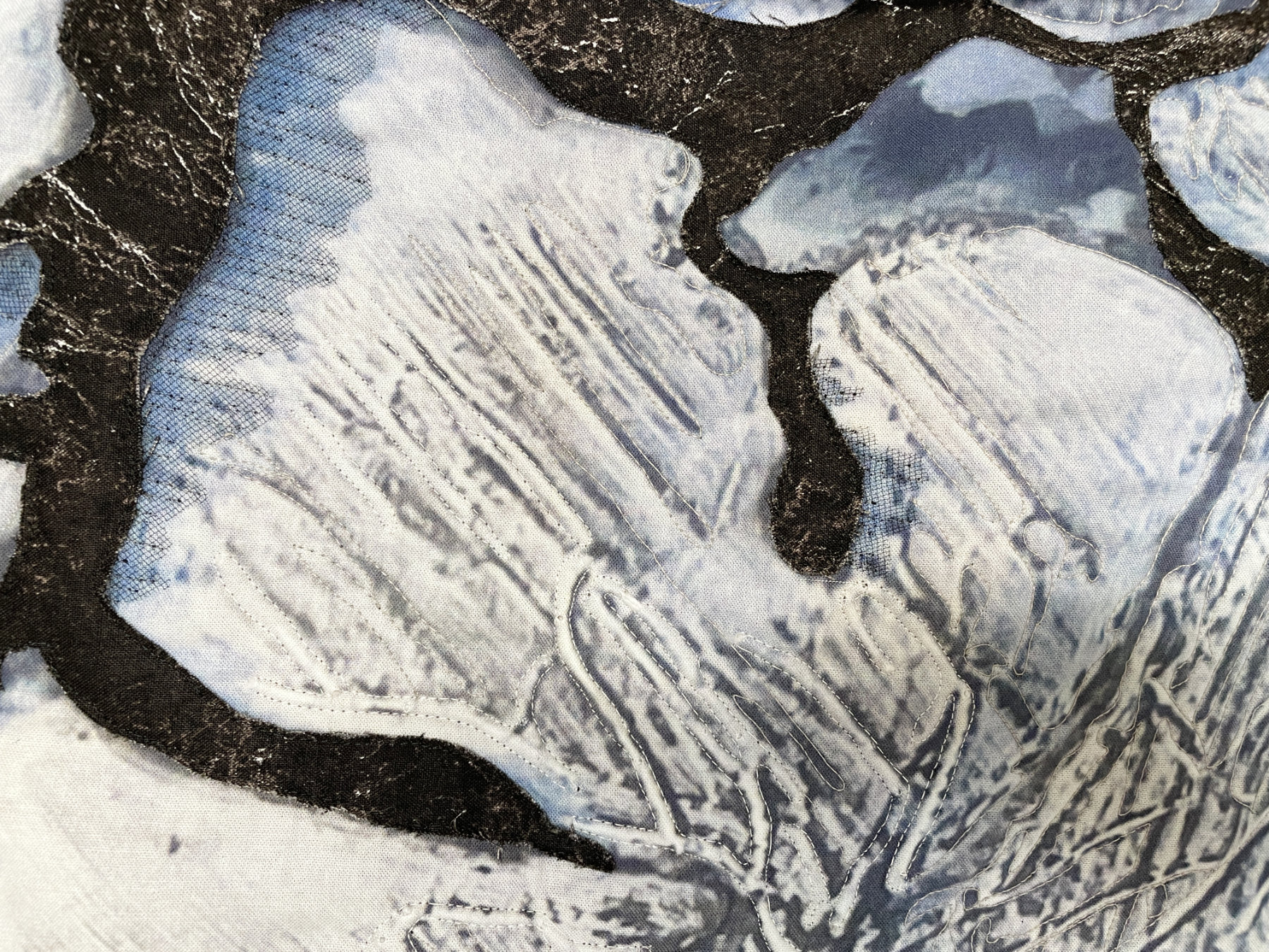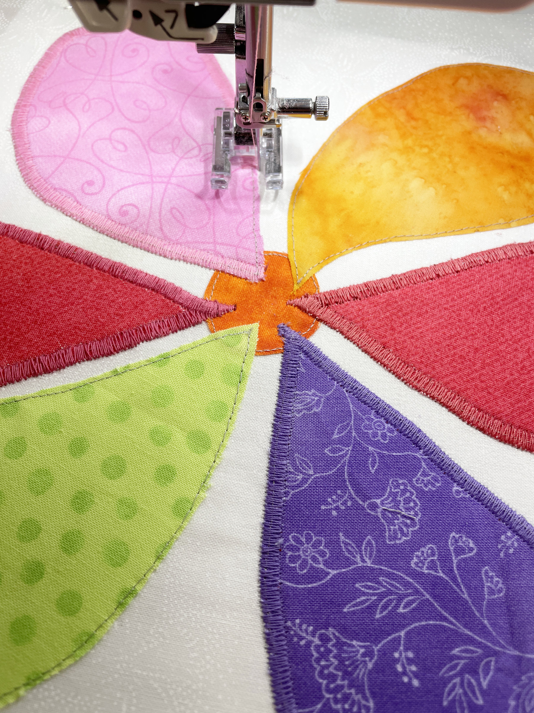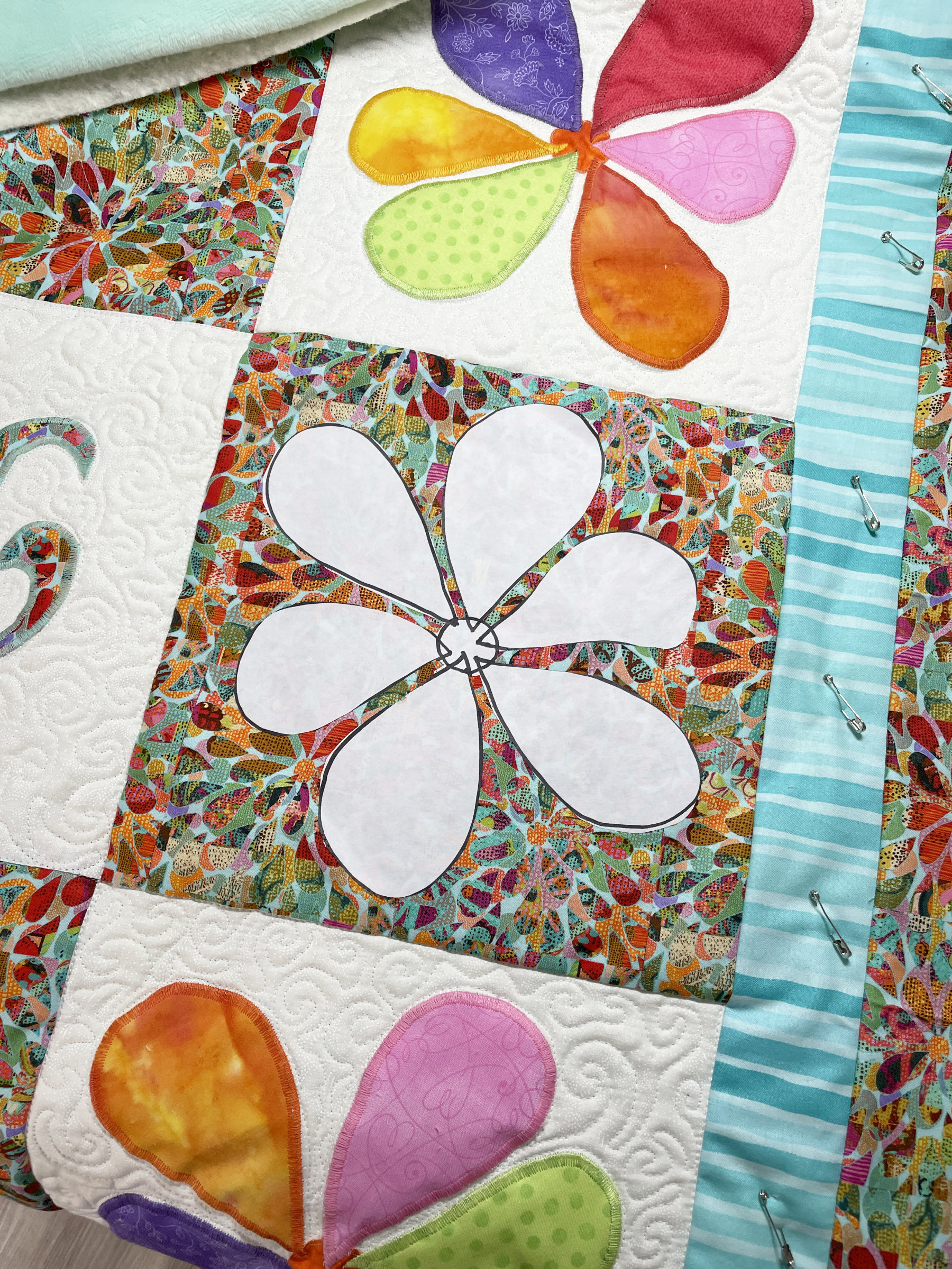 And the last quilt I want to share is a wall hanging of flowers with fun quilting and delightful tiny yo-yos. Jackie’s hand-quilting “knocked my socks off”: