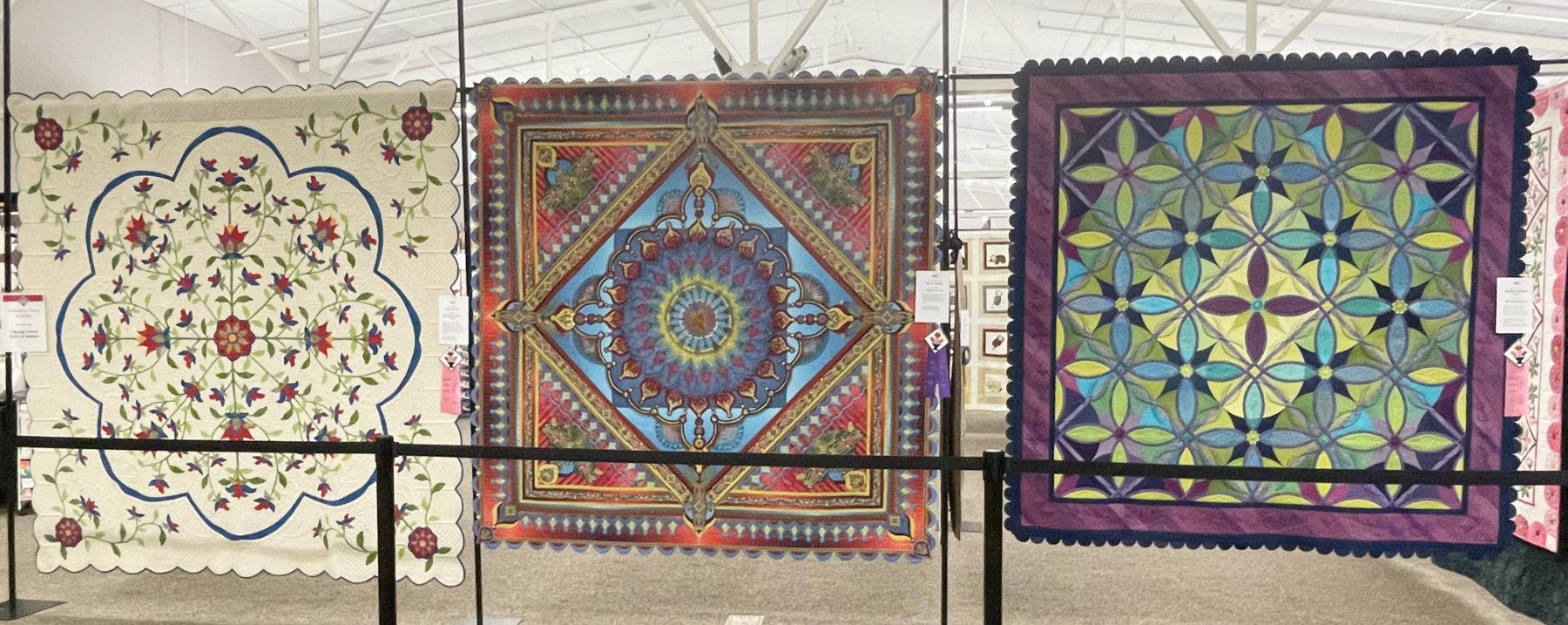 The image at the top of this post is of the top three prize winning quilts. They were made by Barbara Clem, Marilyn Badger and Margaret Solomon Gunn. It was impressive to see quilts from such prestigious quilters in the show, hanging with so many other wonderful quilts made by local and “not-so-local” quilters. And there was so much more!