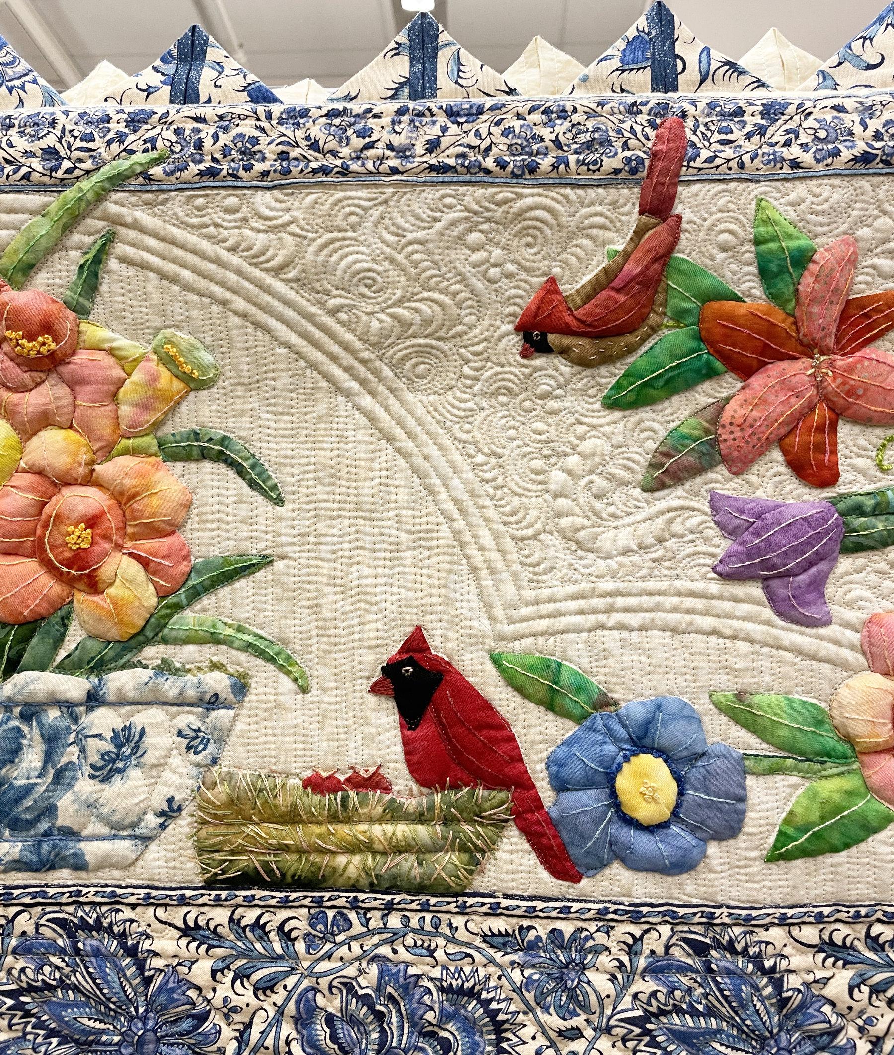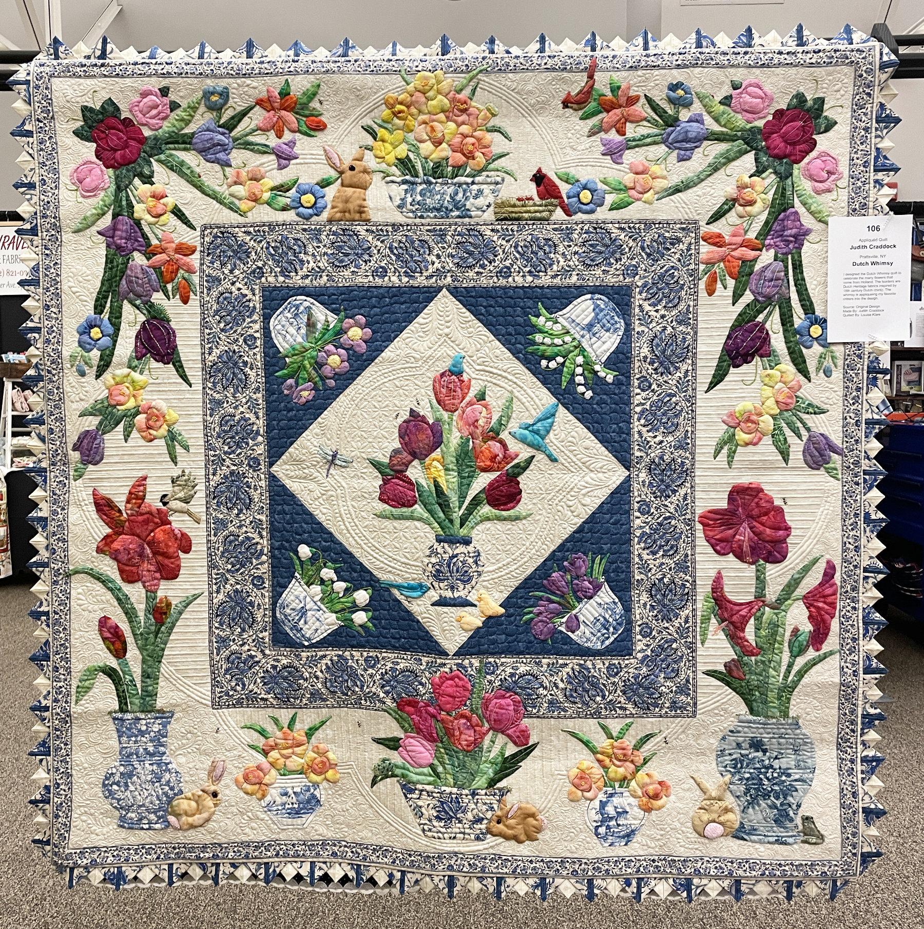 I was honored to be asked to choose one of the quilts in the show as my favorite. I LOVE these opportunities! I don’t have to put my judges hat on. I can just pick a quilt that makes my heart sing. I chose “Dutch Whimsy” by Judith Craddock. Judith did every aspect of this quilt well: fabric choices, appliqués, embroidery, prairie points, and her quilter fit the design perfectly.