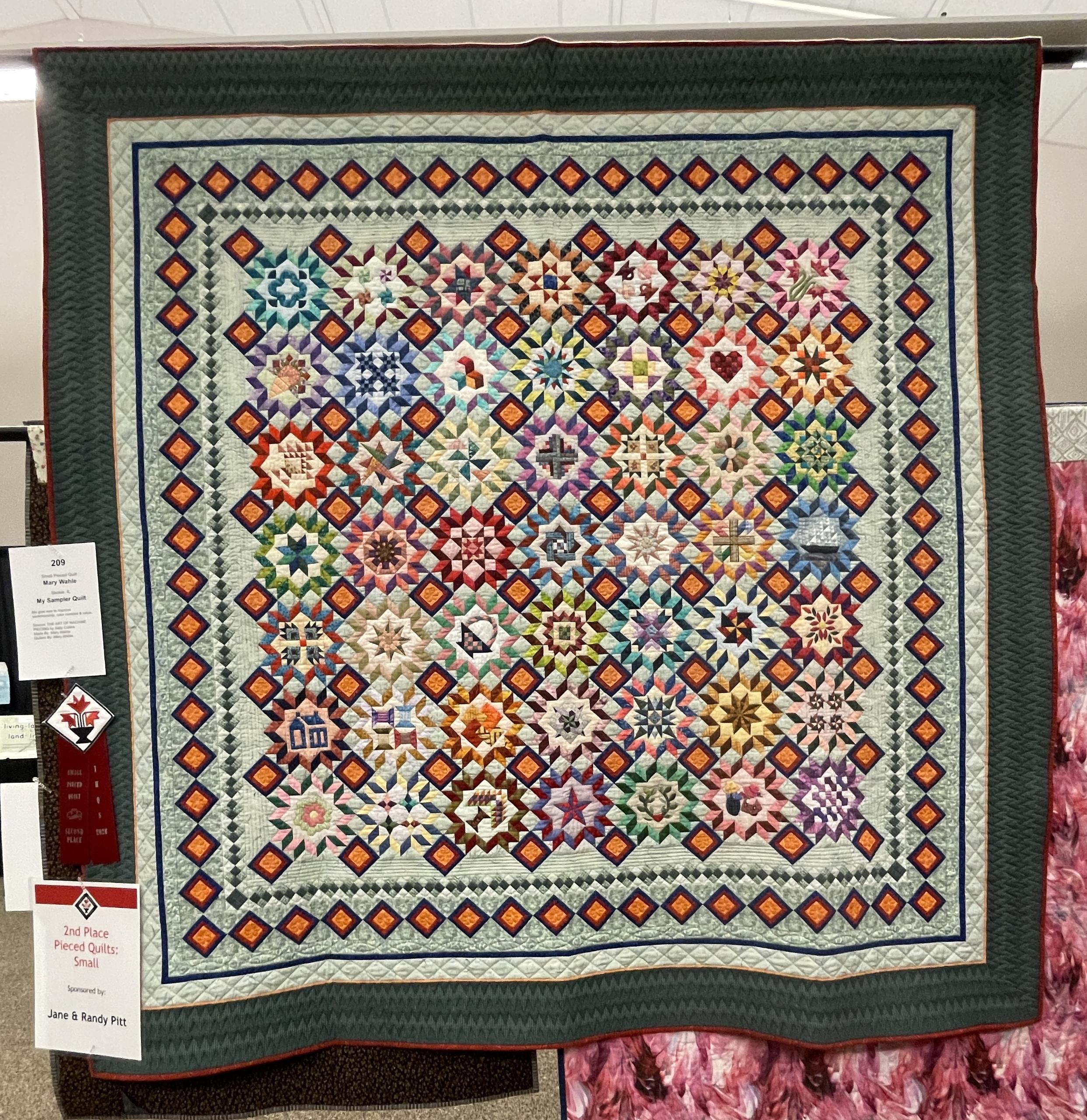 And one more pieced quilt just had to make my list. “My Sampler Quilt” by Mary Wahle does something that always fascinates me. It’s a sampler quilt in a setting that doesn’t scream “sampler quilt”. It obviously is, but there is so much additional piecing that it really draws all the diverse blocks into a pleasing whole.