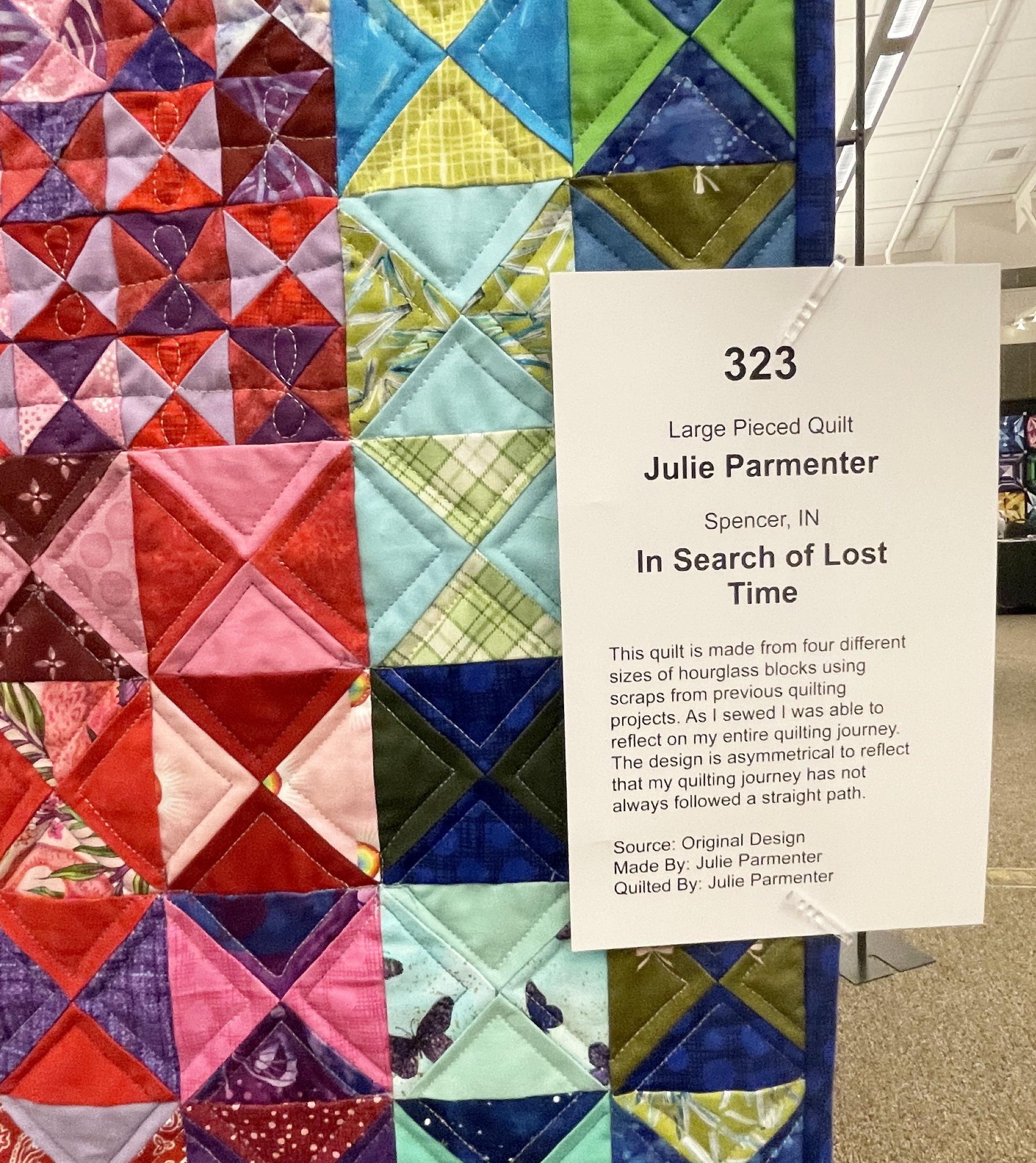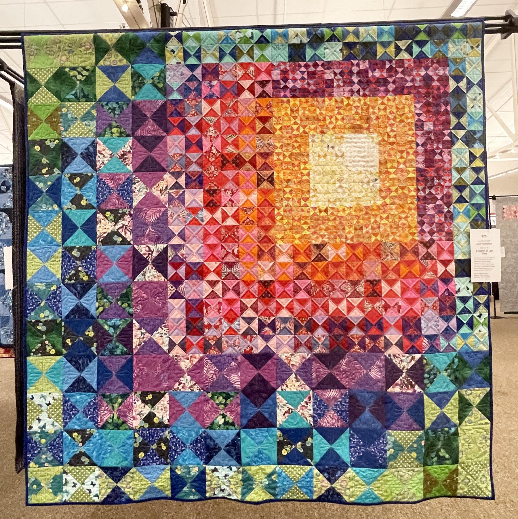 And I think my favorite pieced quilt was “In Search of Lost Time” by Julie Parmenter. She chose to use leftover scraps to make the hour glass squares in 4 different sizes, and arranged them in a very pleasing way. Imagine my delight when I discovered that Julie was in 2 of my classes!