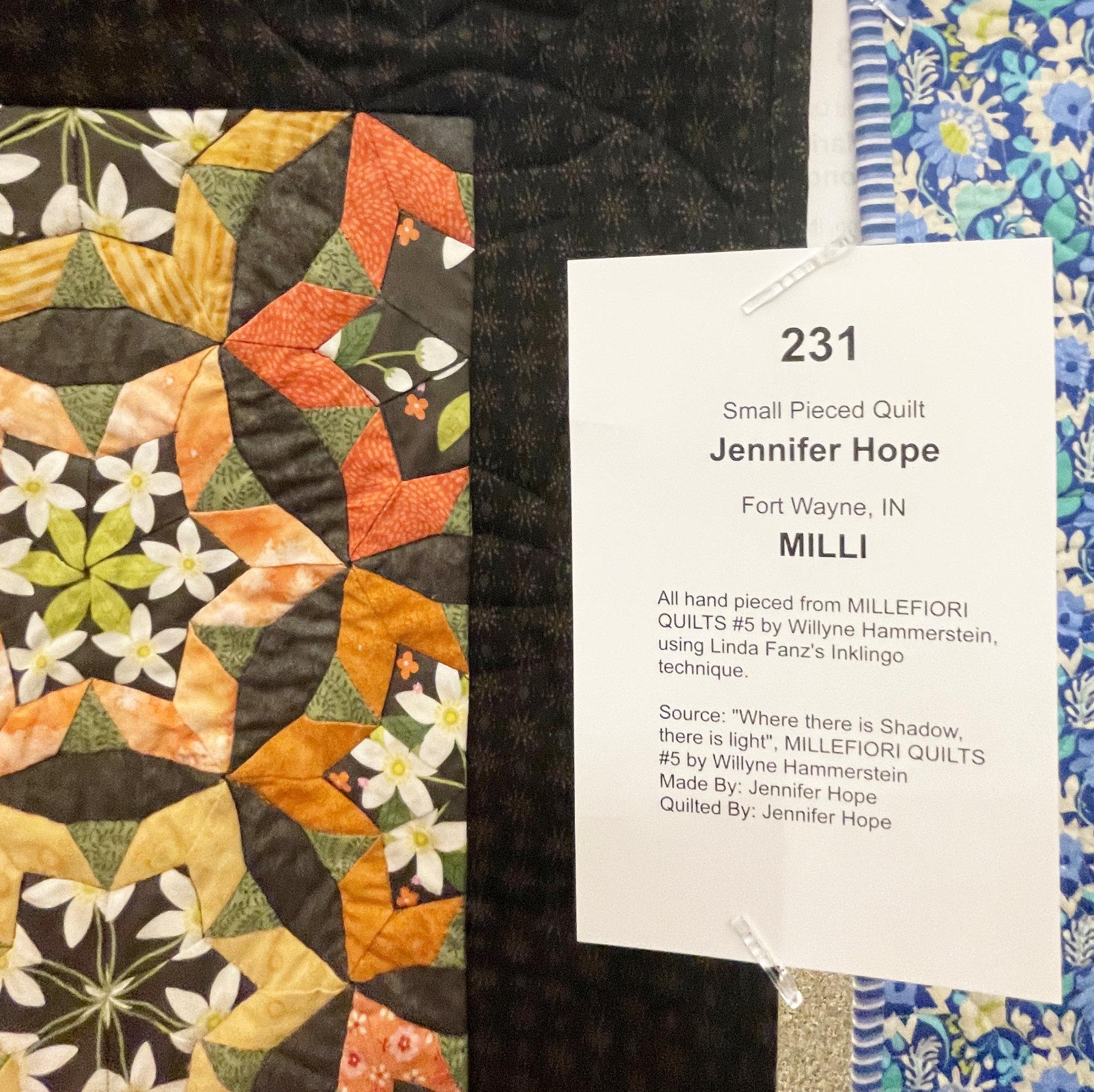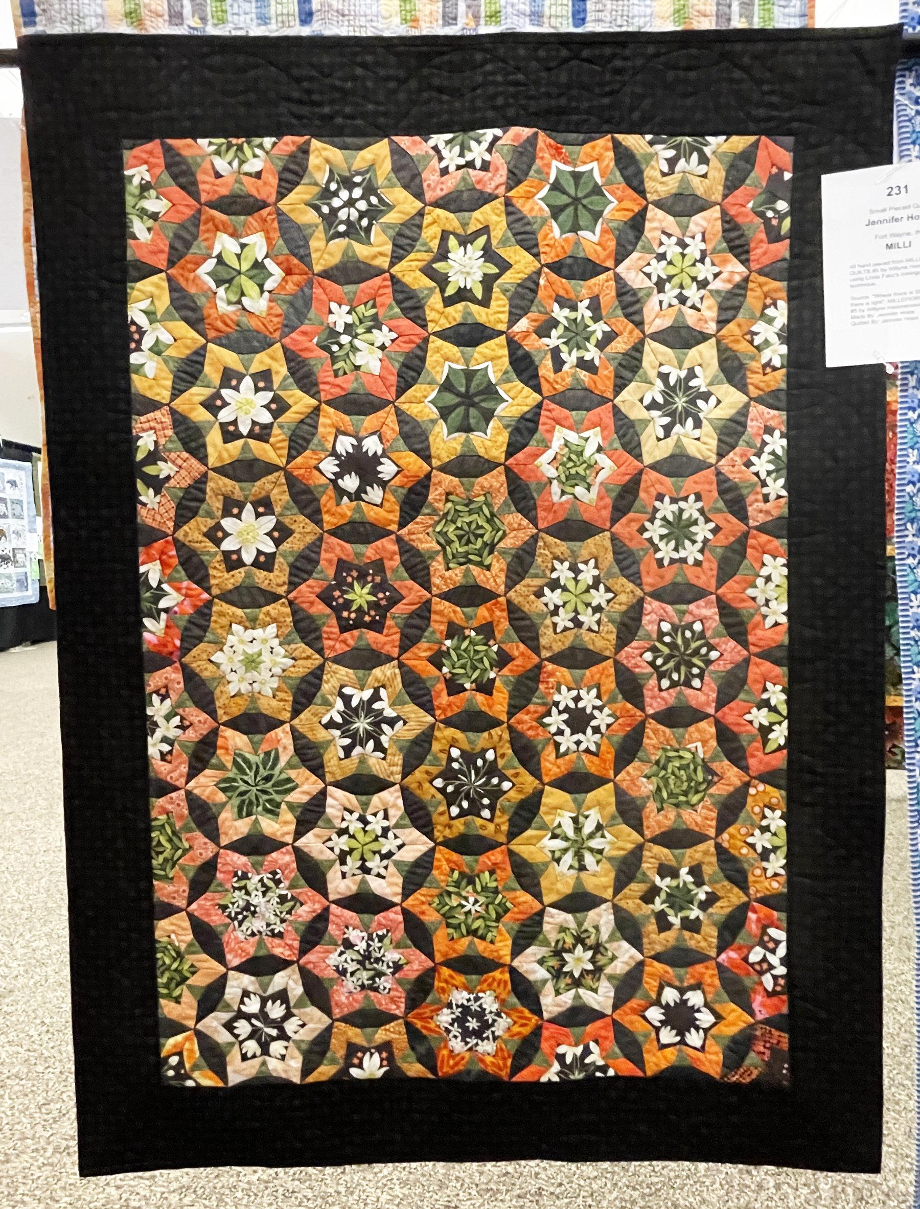 I admire hand piecing, but am not very good at it. So, I’m often drawn to quilts by piecers who are. “Milli” by Jennifer Hope is a stunning example: