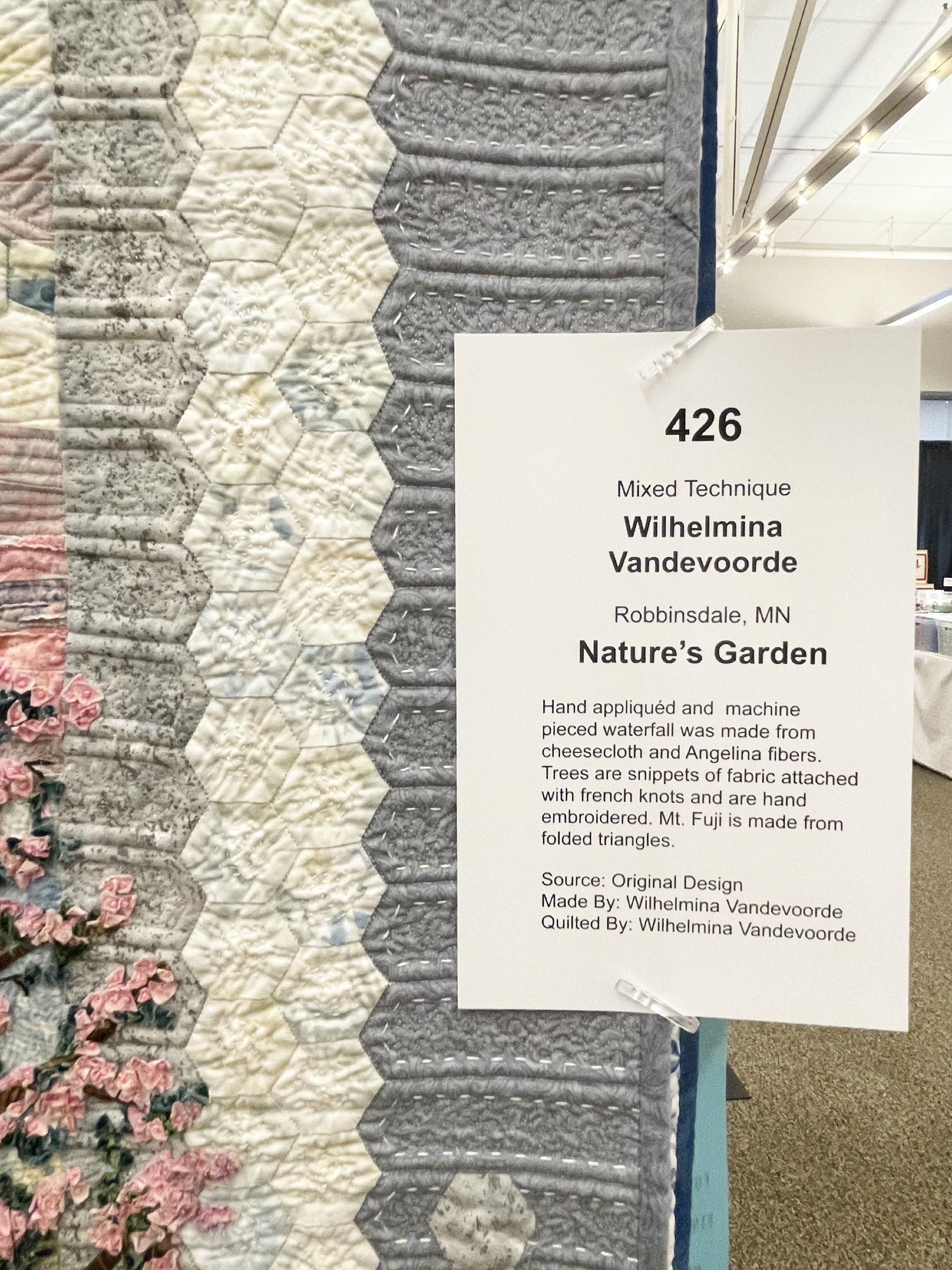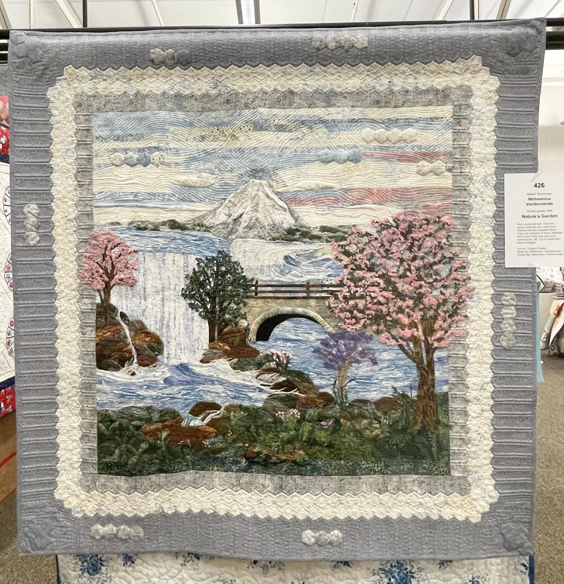 So, as I walked through the show before the crowds (without the wooden shoes 😁), I snapped a few photos of some of my other favorite quilts. This one also reminded me of a previous quilting adventure. Wilhelmina’s quilt “Nature’s Garden” is a beautiful tribute to Mt. Fugi during cherry blossom time.