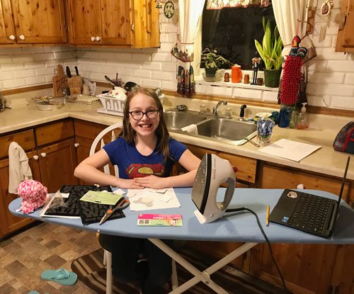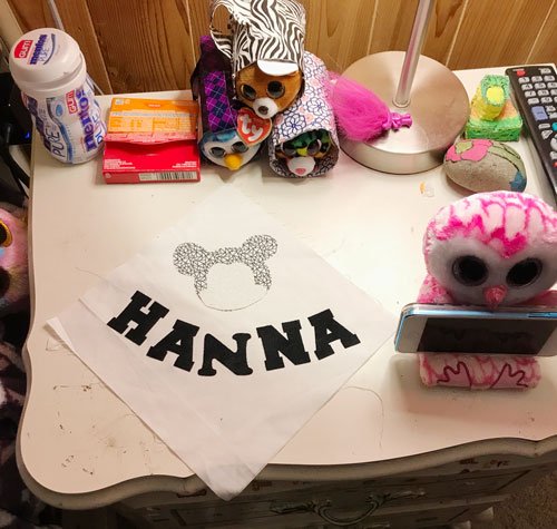 I love Facetime and being able to “talk” to the kids via video. A while ago, Hanna said she wanted to make a pillow with a “critter” of some sort on it. Since she doesn’t have a sewing machine, I thought she might enjoy fusing. So I sent her a bunch of fabric and a length of Heat ‘n Bond™ paper backed fusible web. She thanked me when it arrived and then didn’t mention it again. A little while later she “called” to say she wanted to start. I’d made her a video on how to use the fusible and texted it to her, but she wanted me to talk her through it via FaceTime. I watched her set up the ironing board, we talked about iron safety, and she gathered the supplies.