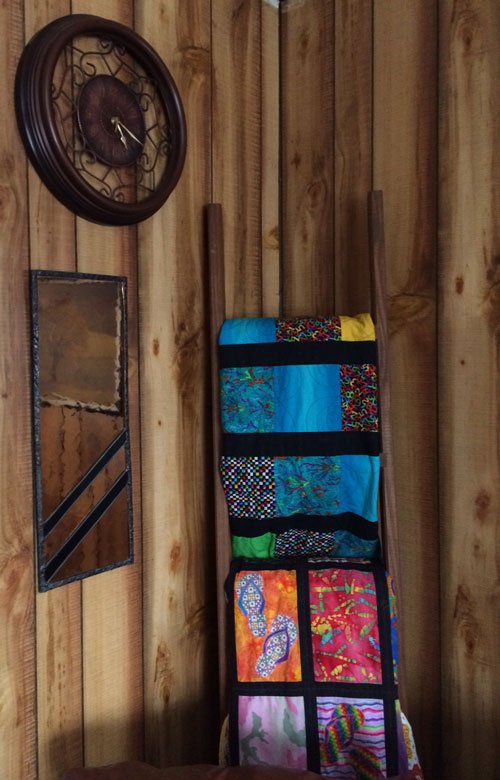The concept is quite simple and it requires 2 easily obtained supplies: an empty toilet paper roll and a piece of ribbon. After making enough binding to go around her quilt, Jean rolls it onto the toilet paper roll, threads the roll onto a length of ribbon, ties the ribbon around her neck, and stitches the binding to her quilt. The binding feeds evenly off the roll in an extremely organized fashion. Brilliant!