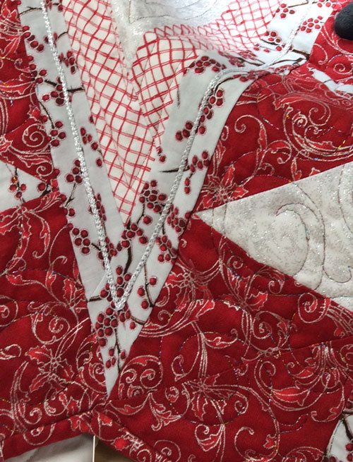 Fast forward to this past Christmas. Connie, another Open Lab friend, was making tree skirts (I posted about them in December – click here for that post). She chose to couch silver cording onto one of the tree skirts (for couching instructions click here). Jean just happened to have one of her special rolls with her and it made the couching oh so much easier: