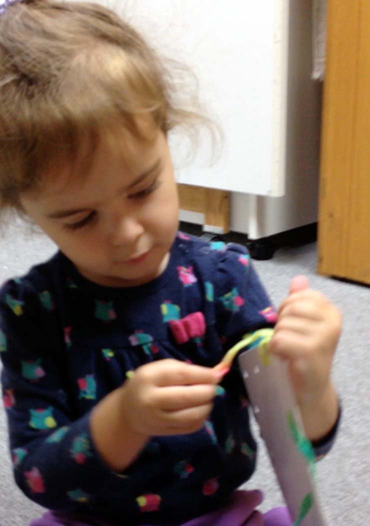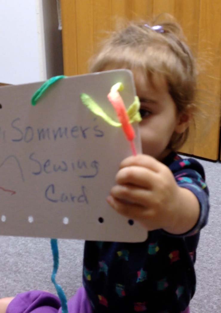 Sommer and I had a sewing adventure this past week and I just have to share. She came over wearing pants that were about 1 ½” too long. Grandma decided she needed to do a quick hem job and Sommer was fascinated watching me thread the needle. She climbed up in my lap and really examined each stitch I was taking. After a few she said “I do it” and tried to take the needle from me. I told her it was too sharp and she should just watch. My next thought was: “I wish I had an old fashioned sewing card for her”, then: “where can I buy them nearby”, and this was followed quickly by “you own a paper punch – go find some cardboard” 😀 ! In a short amount of time she had colored on her card, I wrote her name on it and then found an old rainbow colored shoe lace. I took a video as she stitched, and you may click here to watch it. Here are a few pictures of Sommer sewing!
