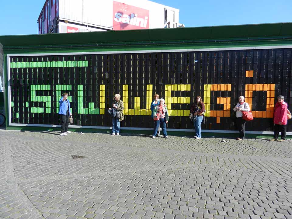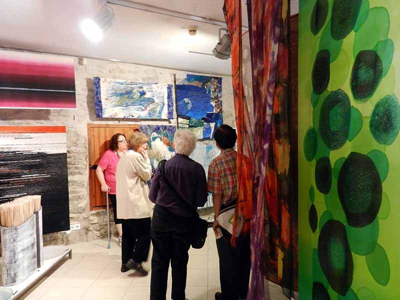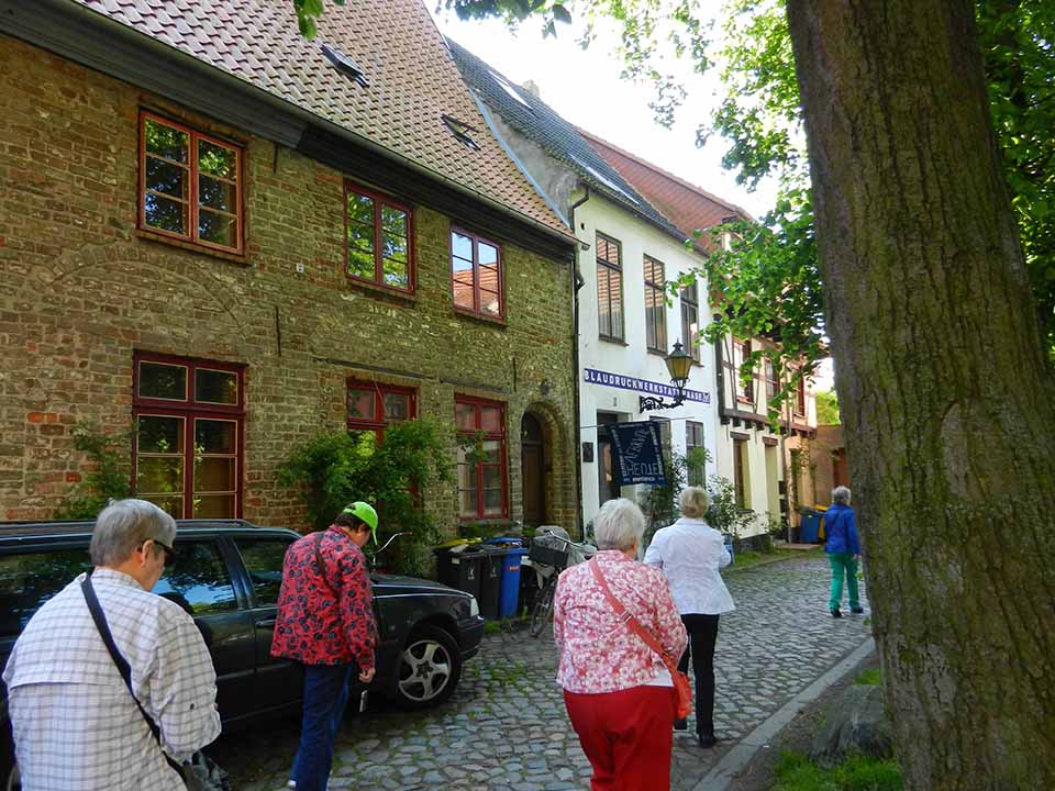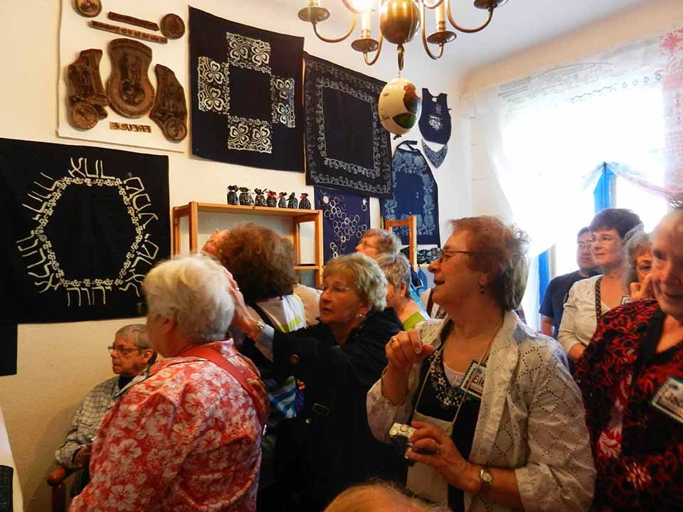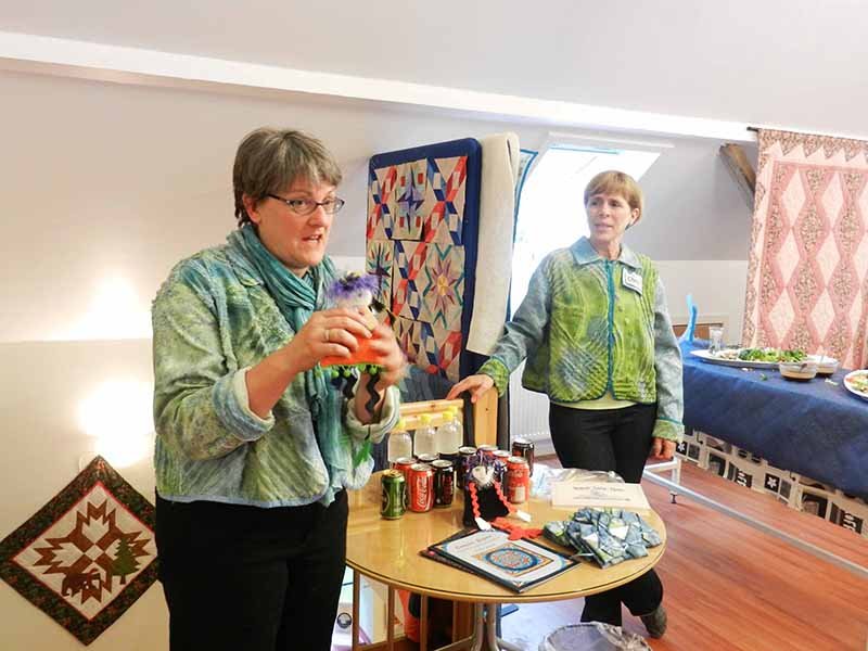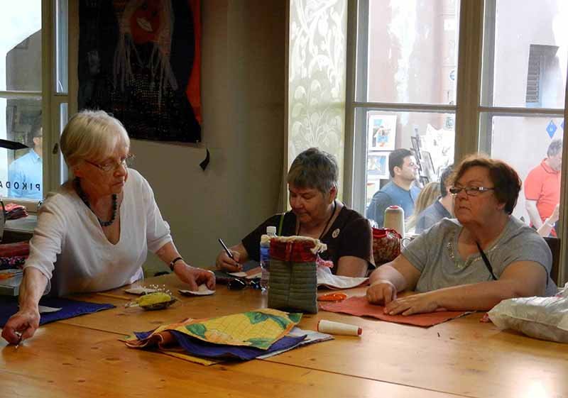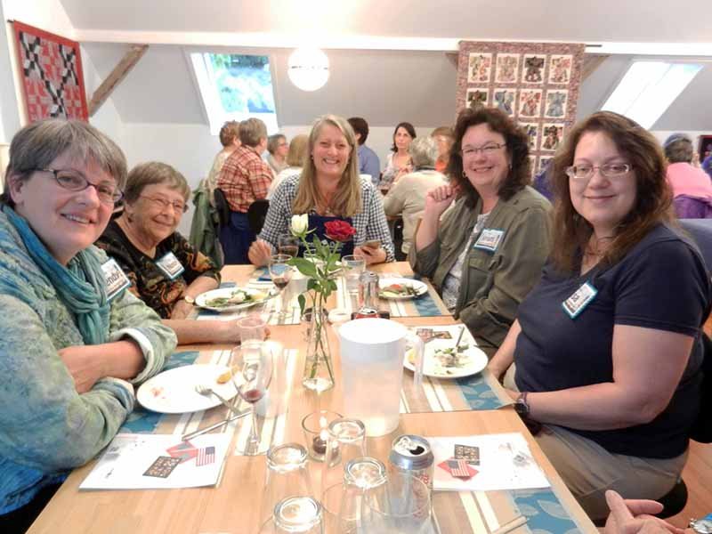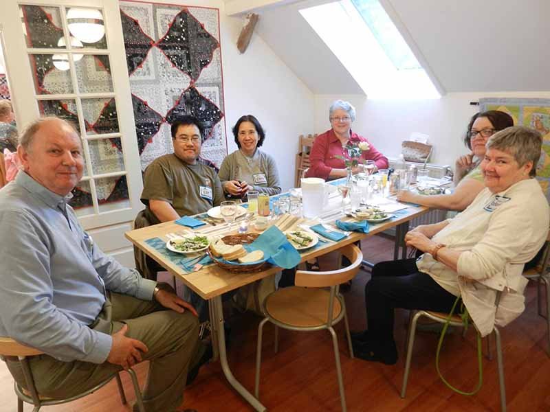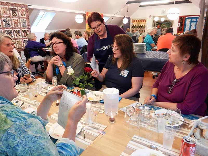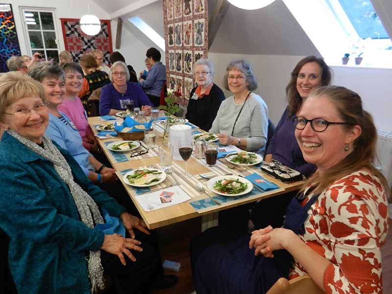 When we had dinner at the quilt shop near Copenhagen, a Danish quilter named Kirsten, dined at our table with us. Here’s the picture from a previous post (Kirsten is in the center).