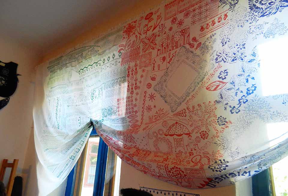 and we began by tracing some of the details of the picture onto tracing paper. Then she helped me pick out a variety of threads from her substantial collection and encouraged me to do a bit of practicing with the threads to decide which ones would work (after posting this picture I realized that the practice piece on the right looks like some sort of weird modern art).