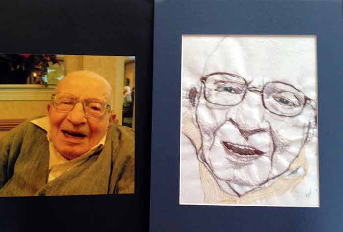 This week I’d like to introduce you to a very talented fiber artist and dear friend. When Sandy Hendricks joined the Milwaukee Art Quilters a number of years ago, she brought with her a portfolio of some of her work, and we were blown away. She’d devised a free motion machine embroidery technique to do portraits in thread of residents in a senior living facility. Sandy was kind enough to allow me to photograph some of these works. Even though I took these pictures rather quickly, and with my phone, I think you will still be amazed at Sandy’s ability to capture the essence of these dear people.