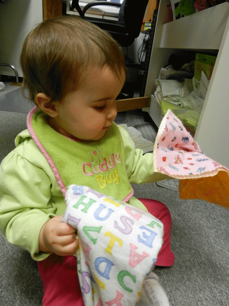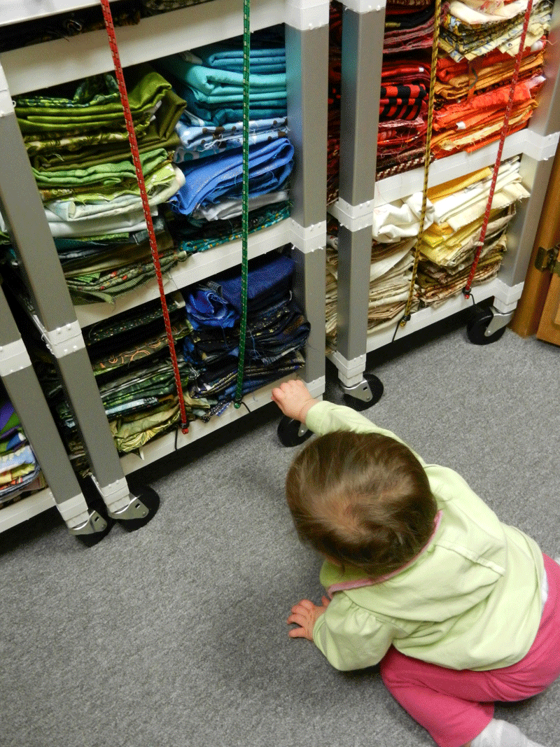 My granddaughter, Sommer, is almost a year old and growing fast. She is a joy and a very easy baby to care for, which is a blessing since Mike and I still watch her 5 days a week! About a month ago she was playing with toys in the middle of the studio and I was choosing fabrics for a quilt. When I had settled on just the right ones I left them in a pile near my stash and went to answer the phone. Sommer was just starting to do a bit of crawling at this time and when I turned around she had crawled over to the fabrics and was reverently petting them one by one as if to say “great choices grandma”!